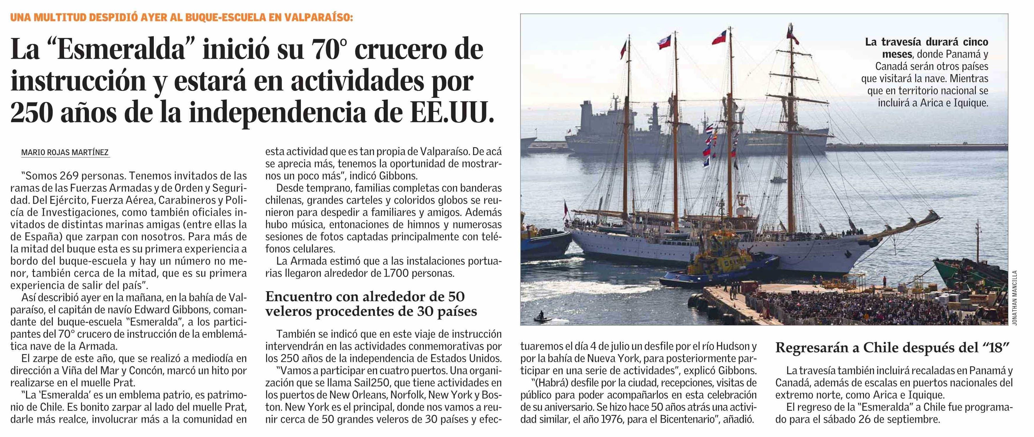 La “Esmeralda” inició su 70° crucero de instrucción y estará en actividades por 250 años de la independencia de EE.UU. 26-04-2026 El Mercurio |