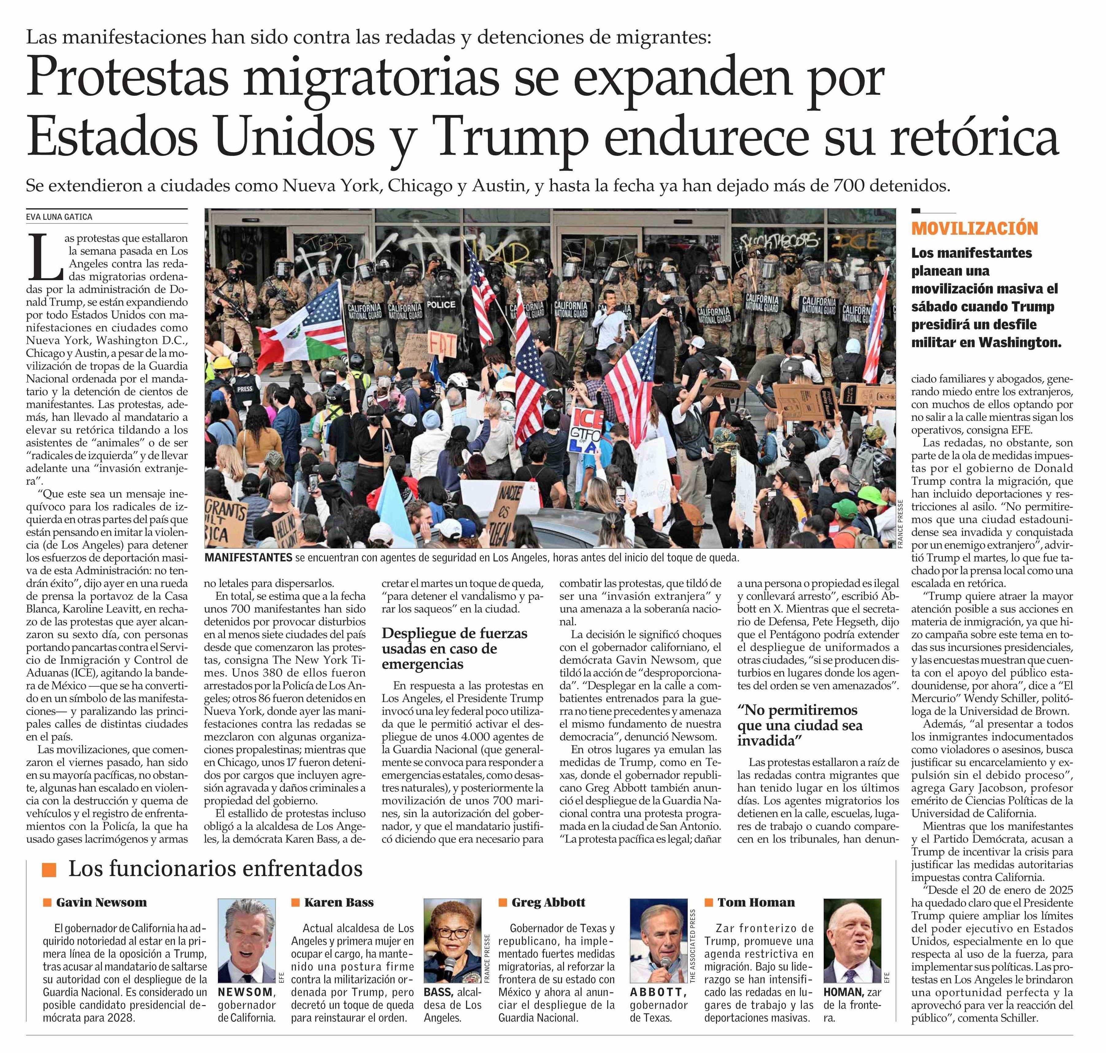 Protestas migratorias se expanden por Estados Unidos y Trump endurece su retórica 12-06-2025 El Mercurio |