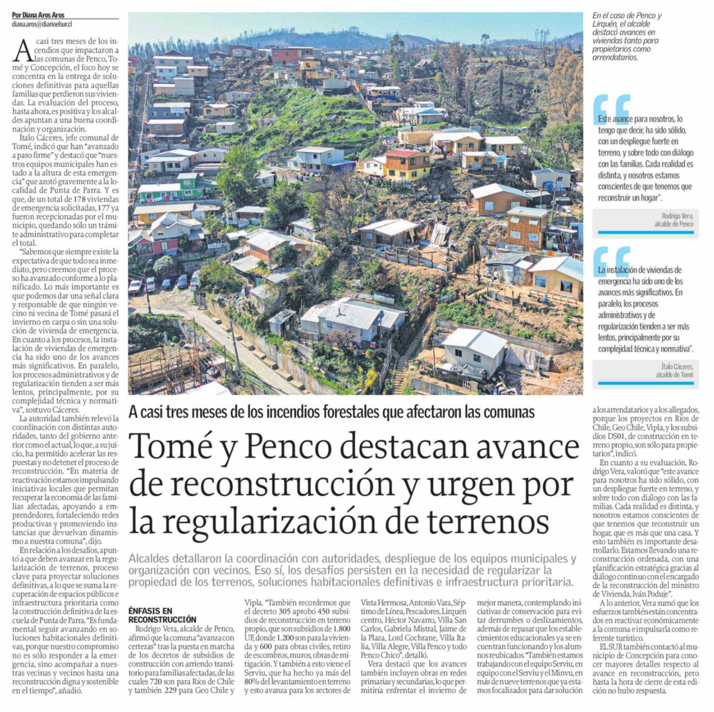 Tomé y Penco destacan avance de reconstrucción y urgen por la regularización de terrenos 13-04-2026 El Sur |
