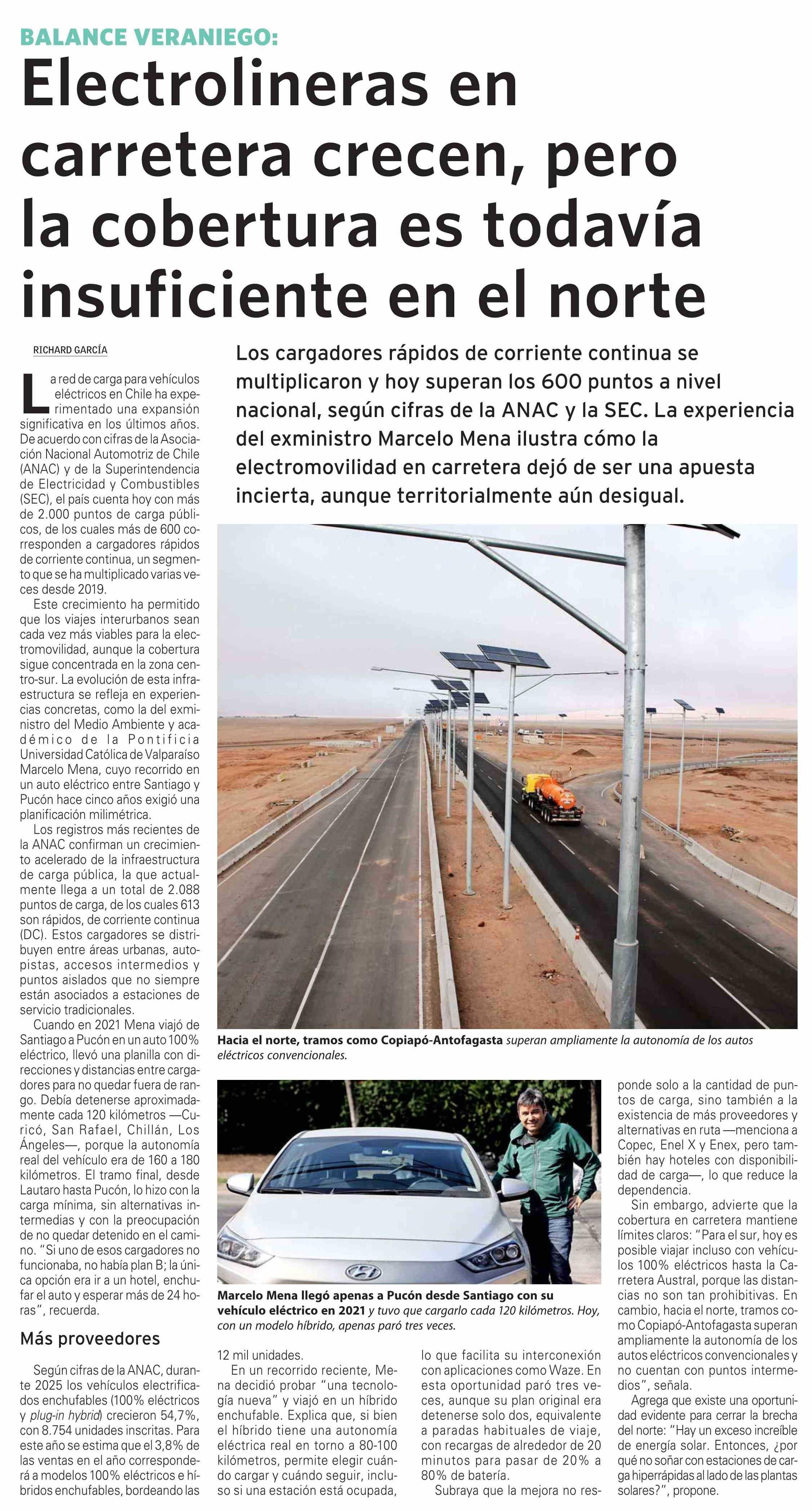 Electrolineras en carretera crecen, pero la cobertura es todavía 11-02-2026 El Mercurio |