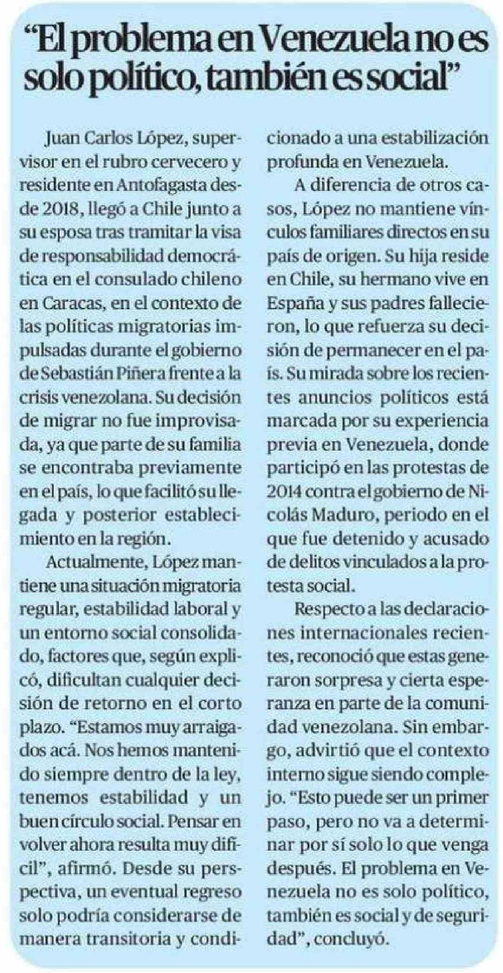 "El problema en Venezuela no es solo político, también es social" 12-01-2026 El Mercurio de Antofagasta |