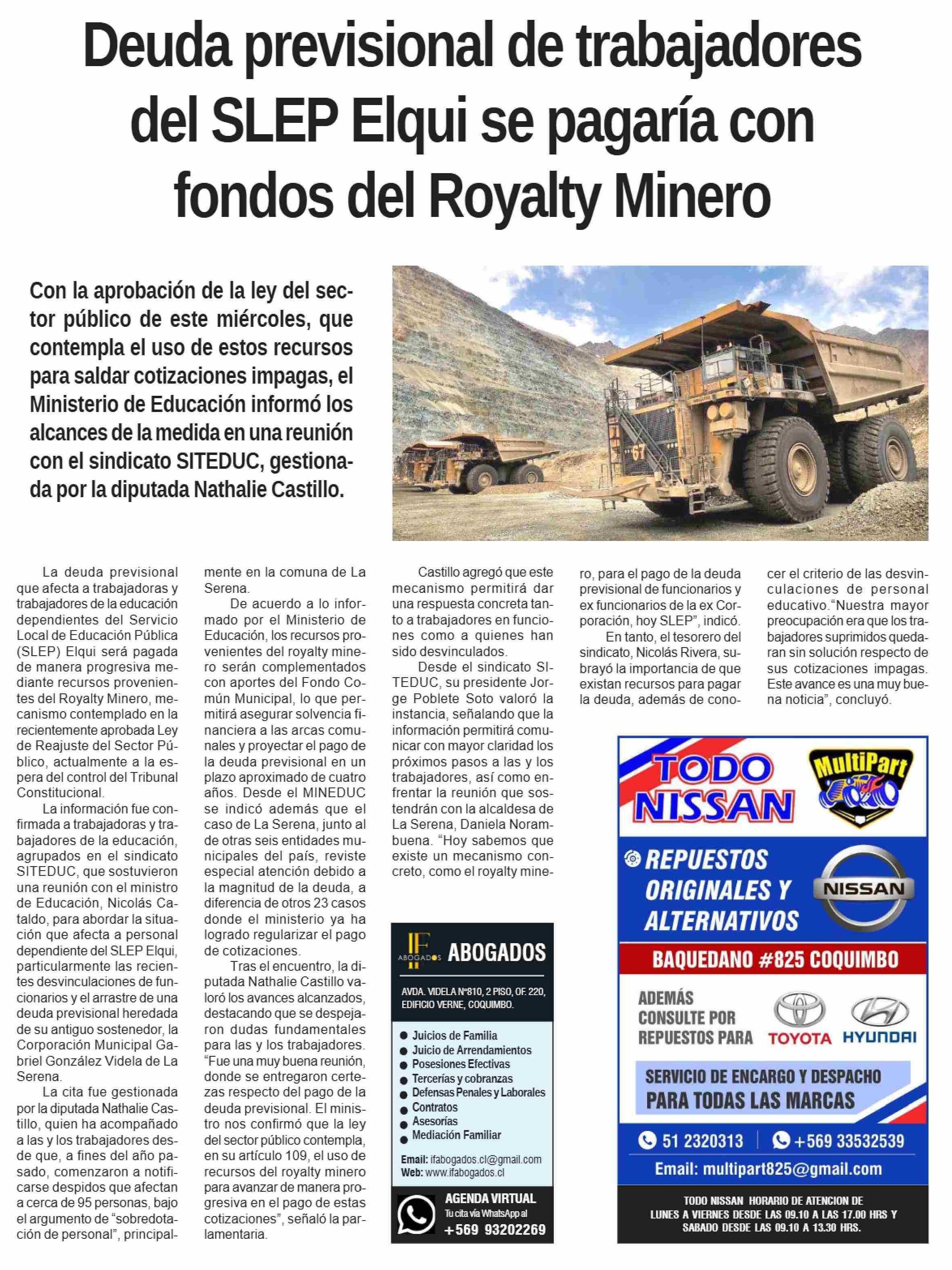 Título: Deuda previsional de trabajadores del SLEP Elqui se pagaría con fondos del Royalty Minero