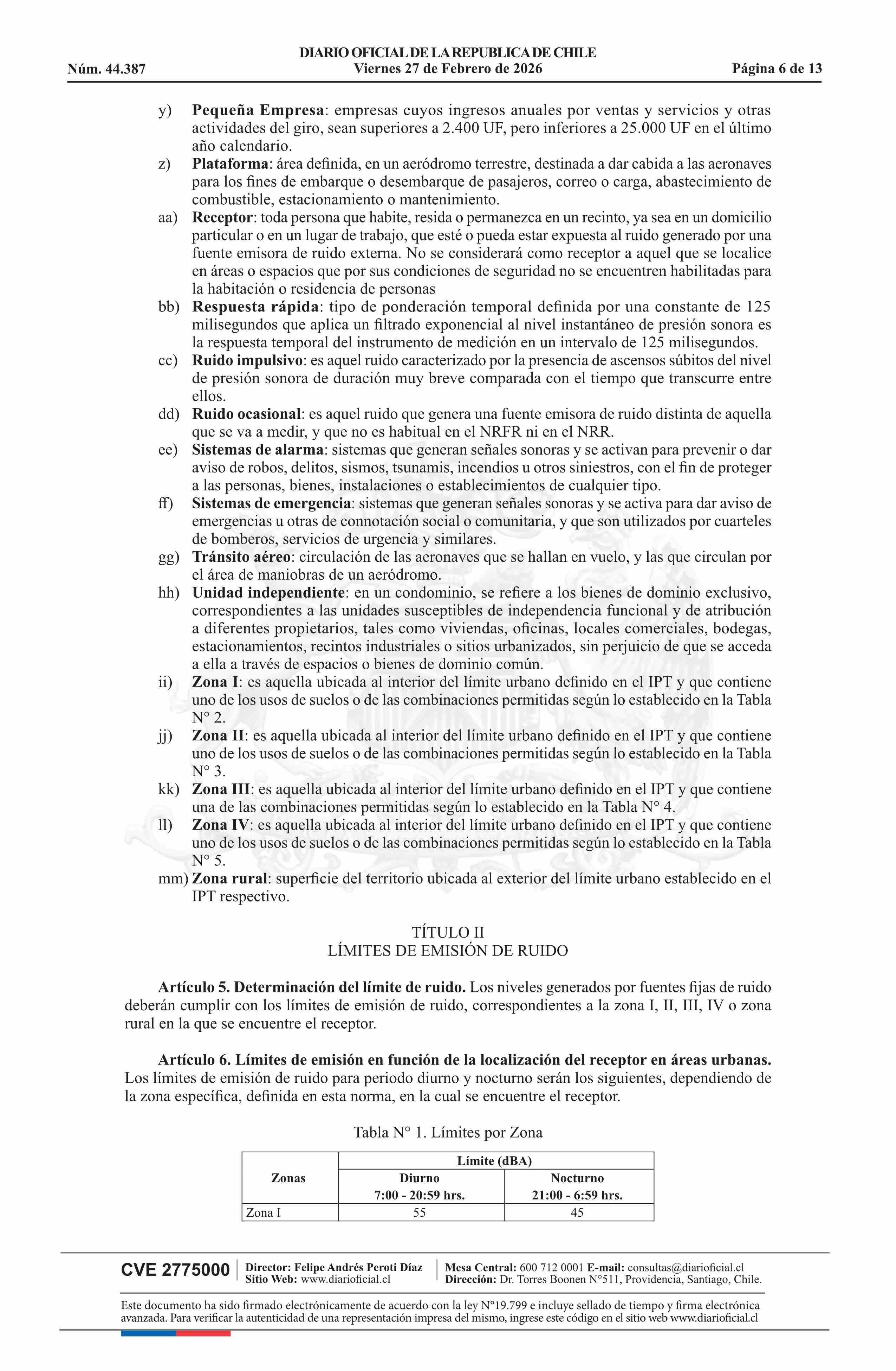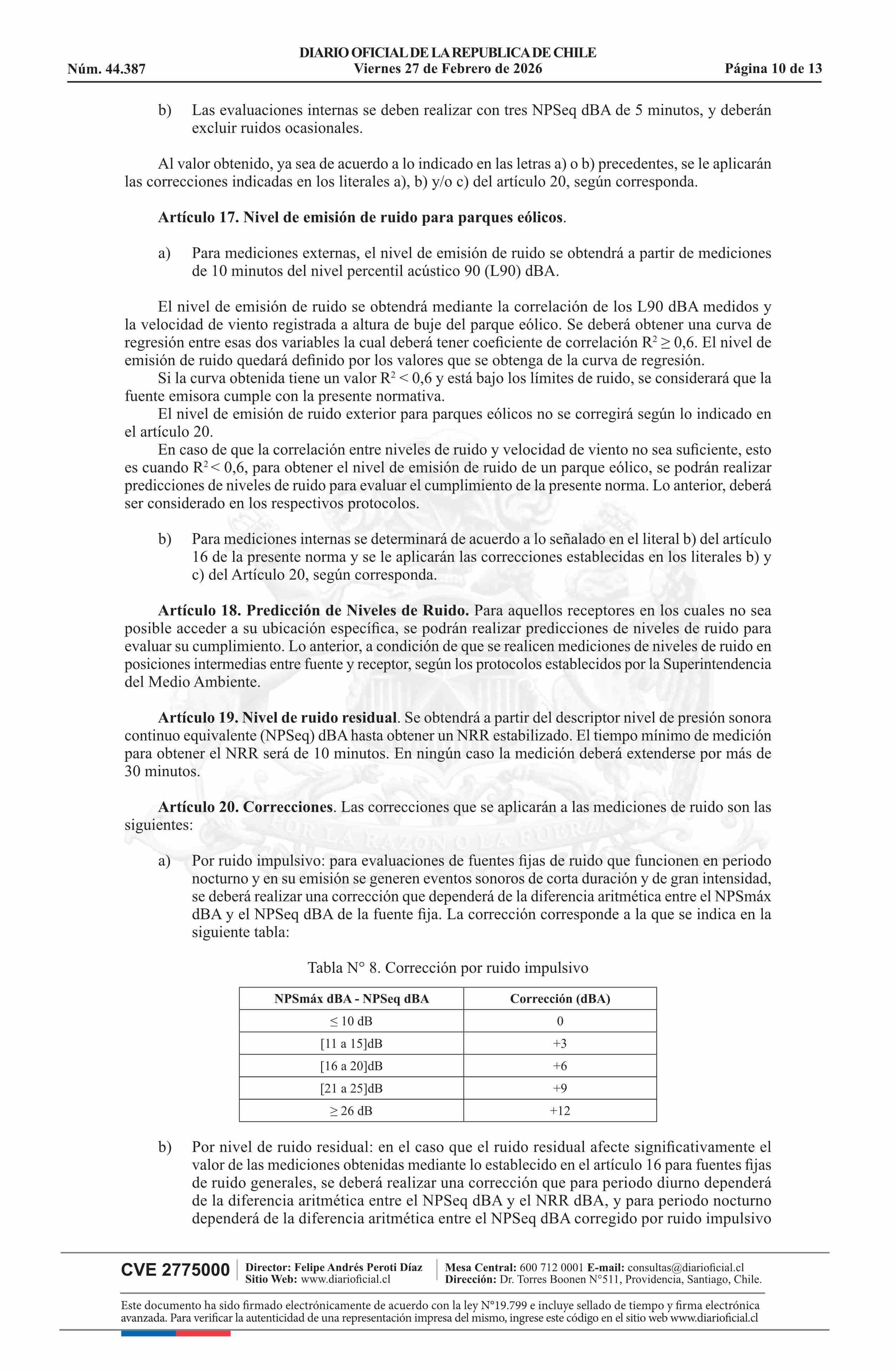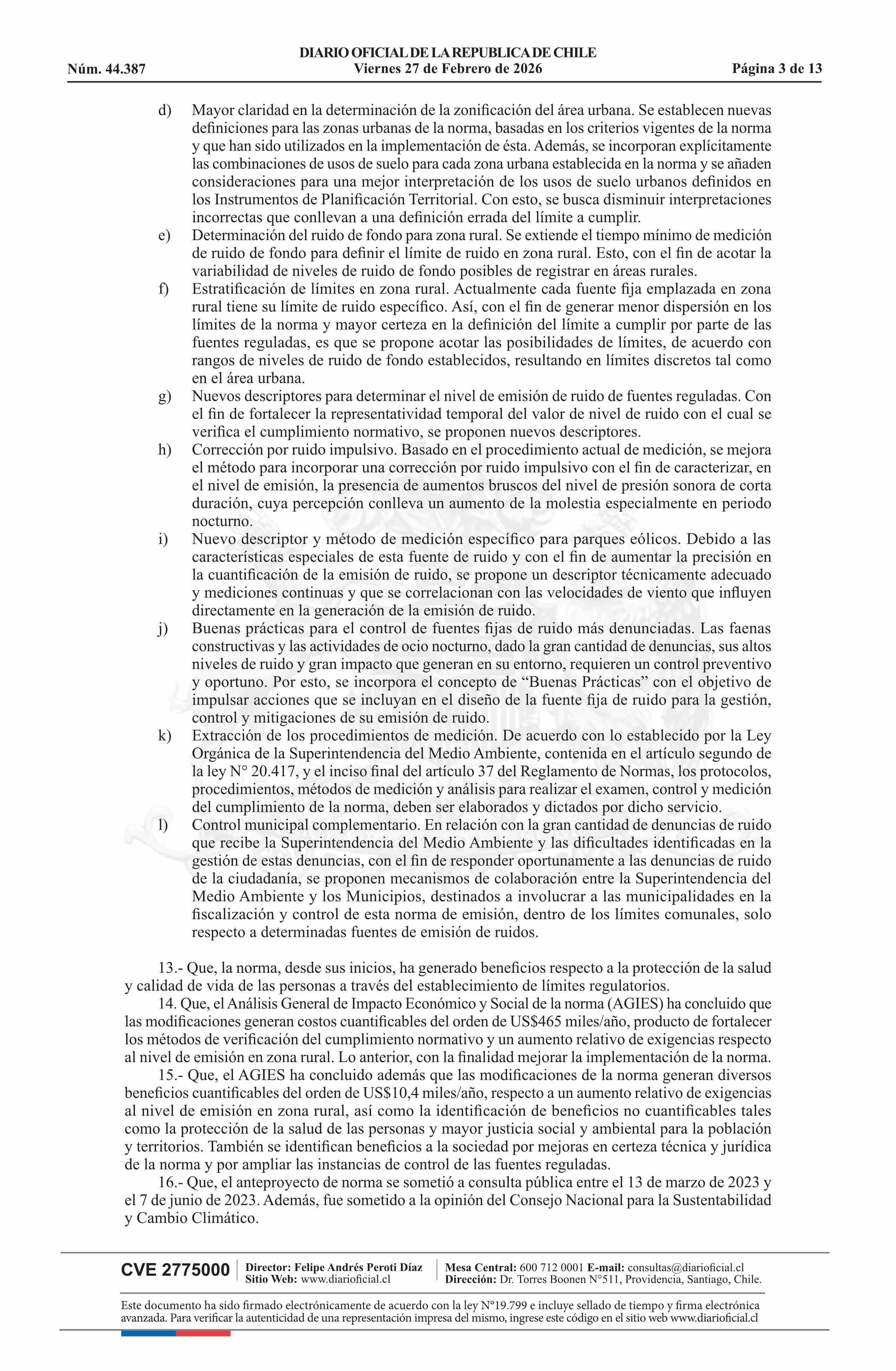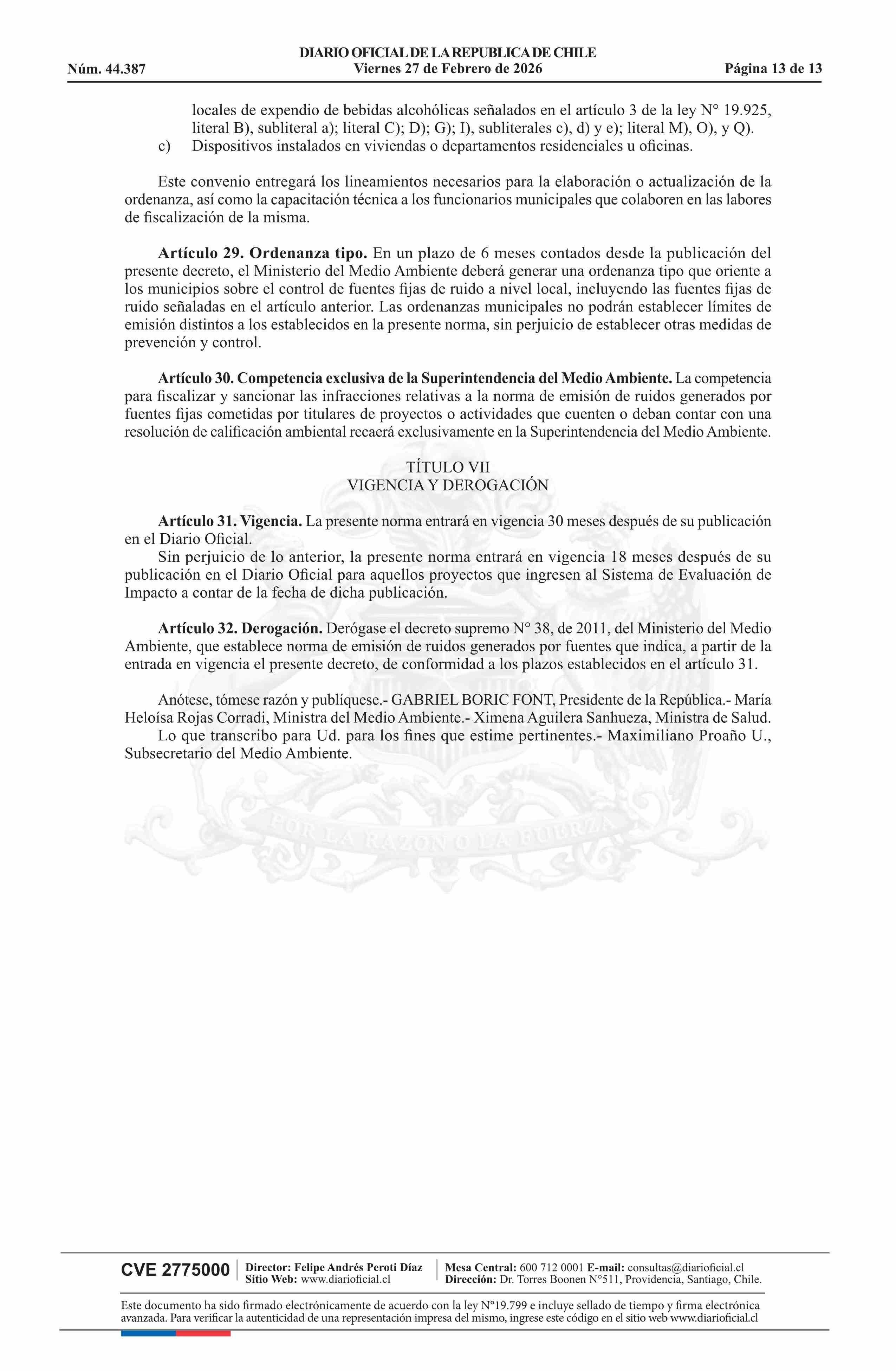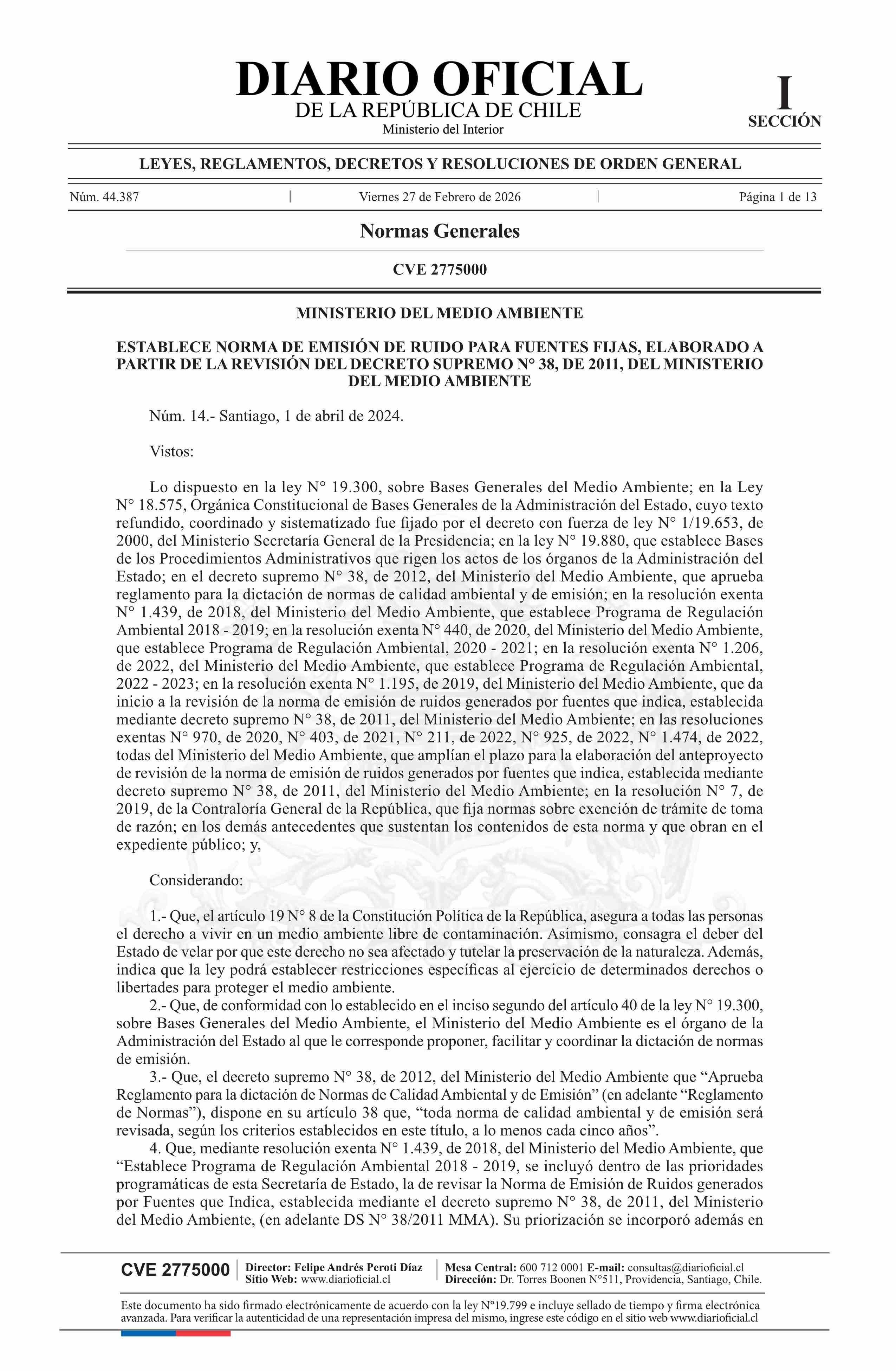 Decreto número 14, de 2024.- Establece norma de emisión de ruido para fuentes fijas, elaborado a partir de la revisión del decreto N° 38, de 2011 27-02-2026 Diario Oficial Edición Electrónica |