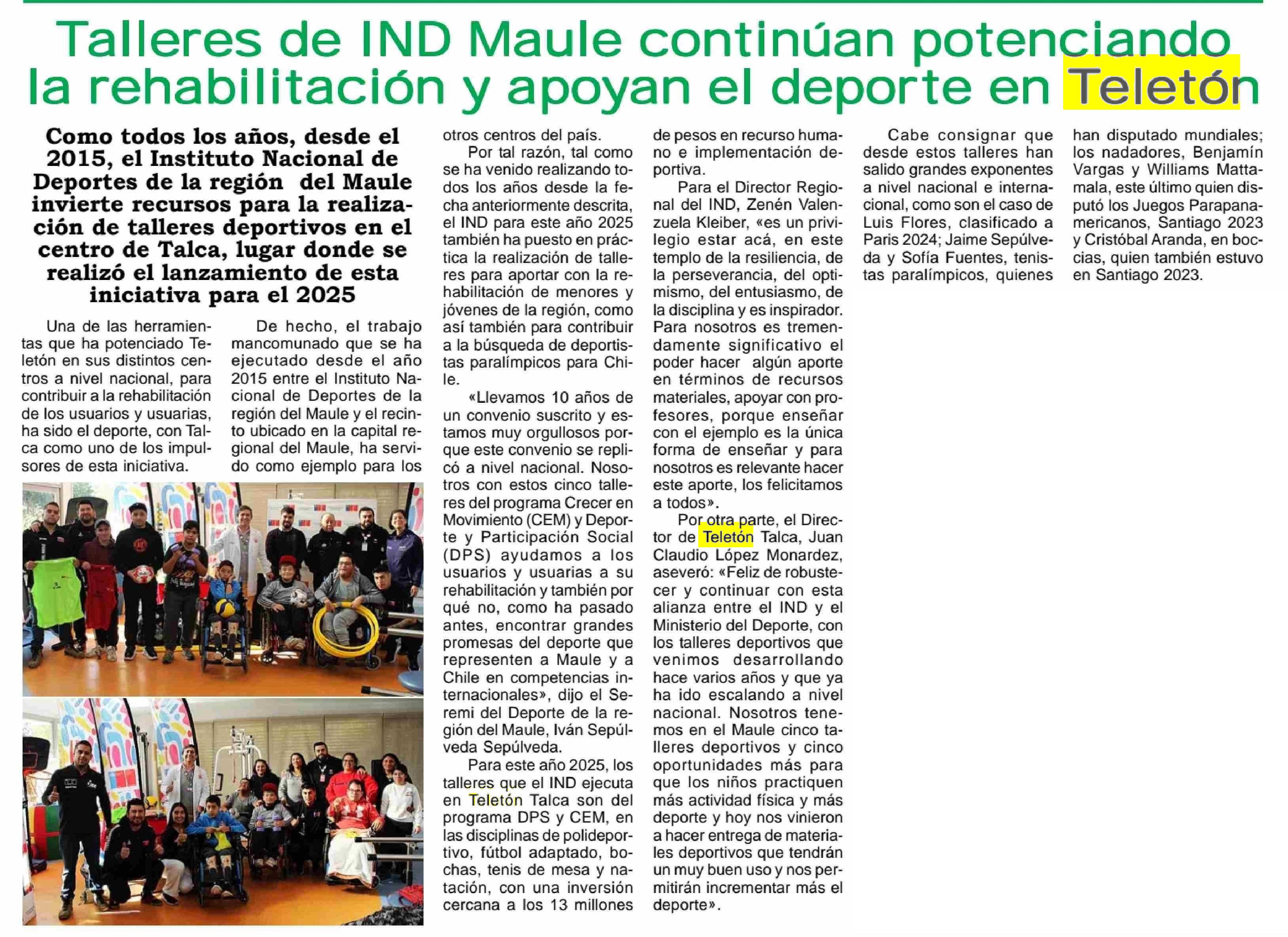 Título: Talleres de IND Maule continúan potenciando la rehabilitación y apoyan el deporte en Teletón