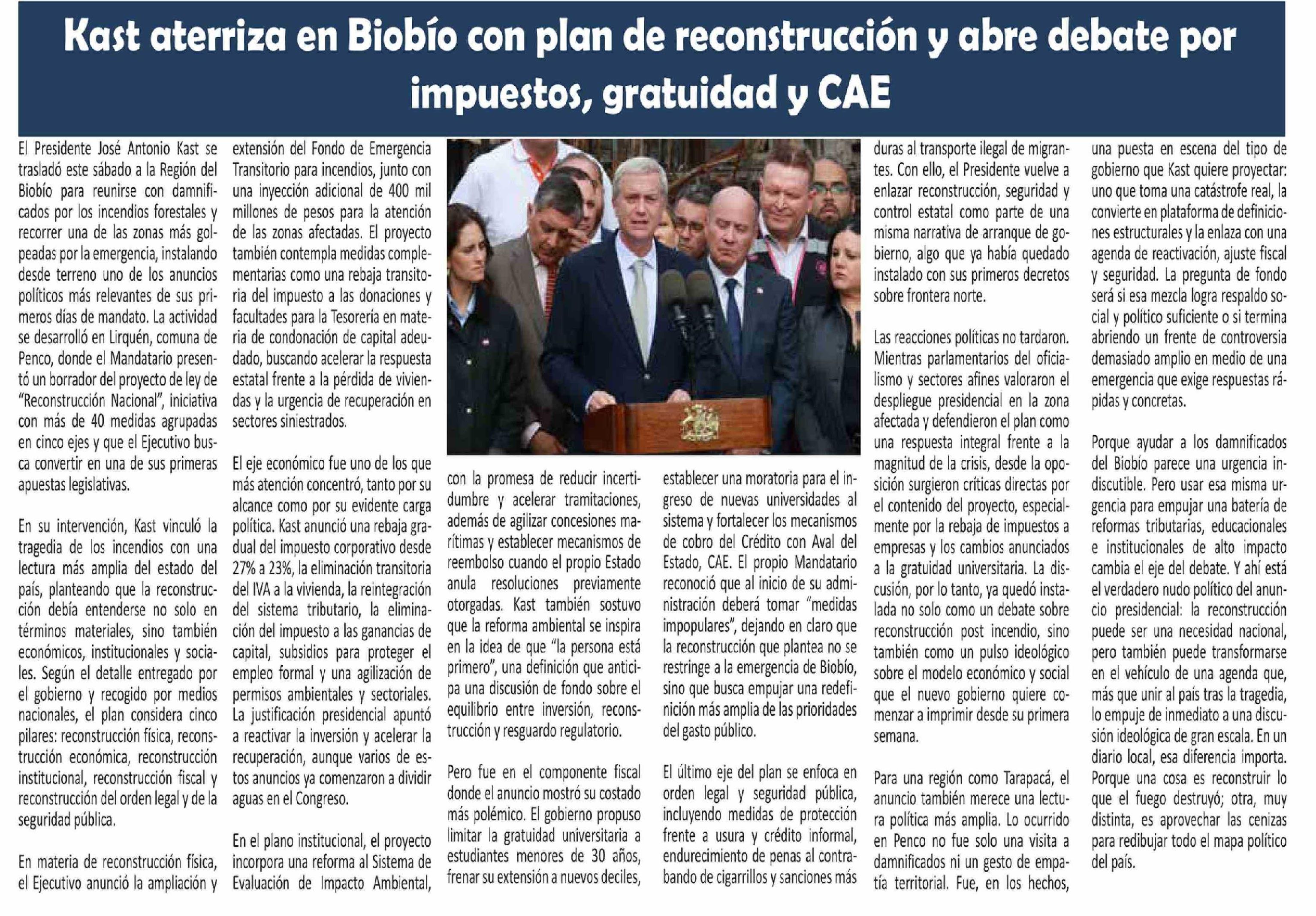 Título: Kast aterriza en Biobío con plan de reconstrucción y abre debate por impuestos, gratuidad y CAE