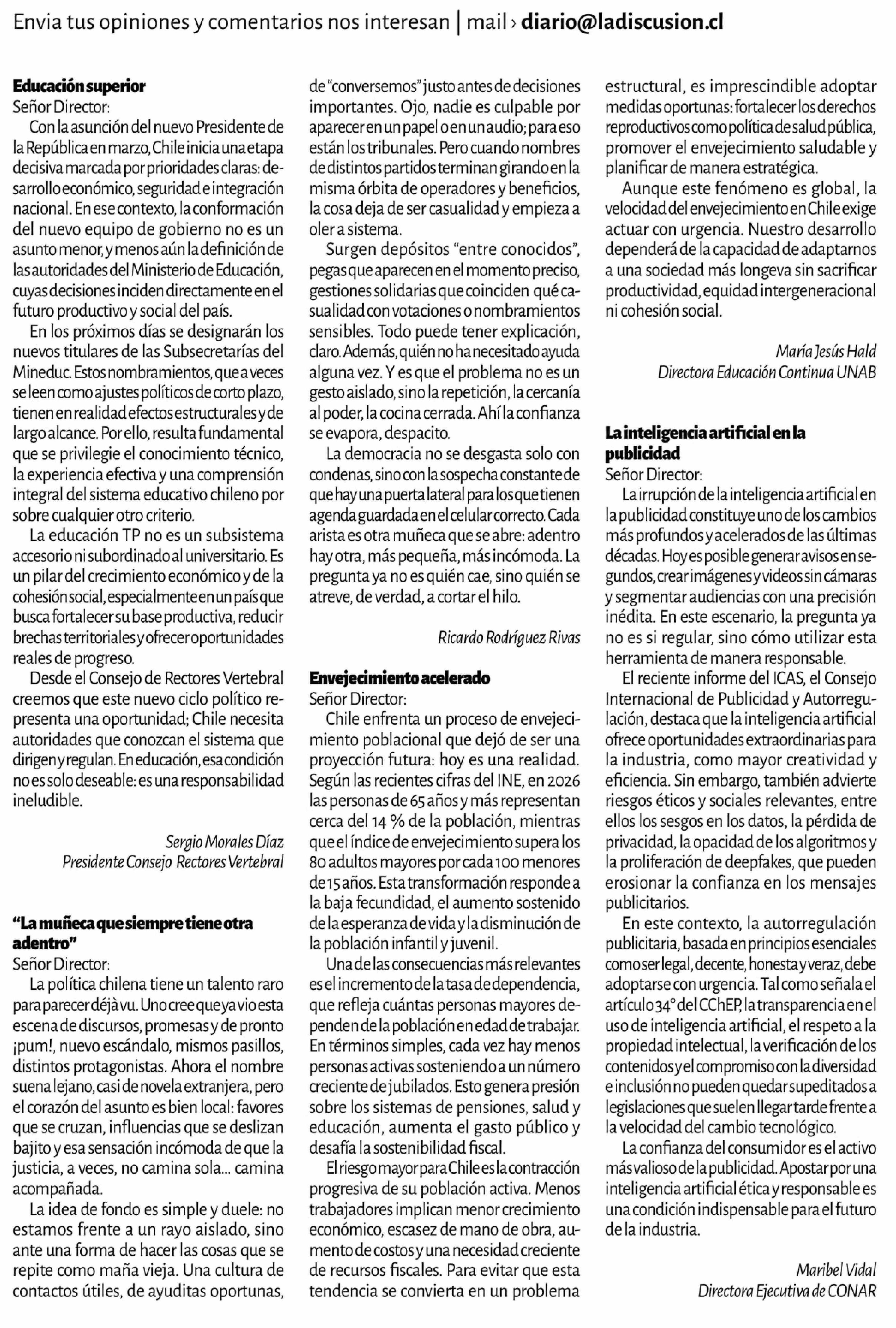 | Título: | Cartas: "La muñeca que siempre tiene otra adentro" Señor Director: La política chilena tiene un talento raro para parecer déjà vu. Uno cree que ya vio esta escena de discursos, promesas y de pronto ¡pum!, nuevo escándalo, mismos pasillos, distintos protagonistas. Ahora el nombre suena lejano, casi d |