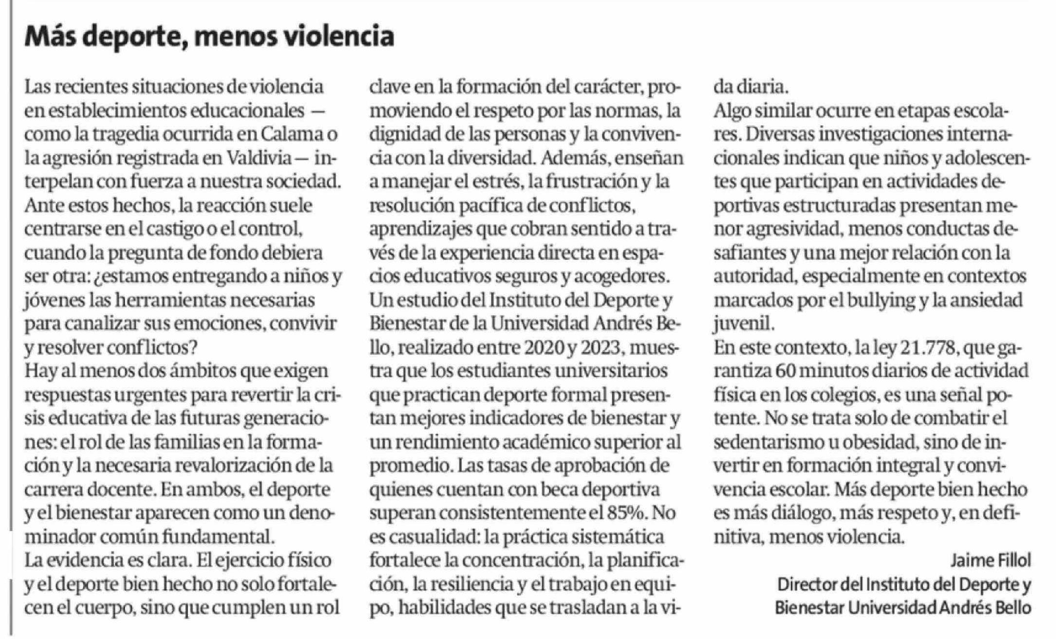 Columnas de Opinión: Más deporte, menos violencia 29-04-2026 La Estrella de Arica |