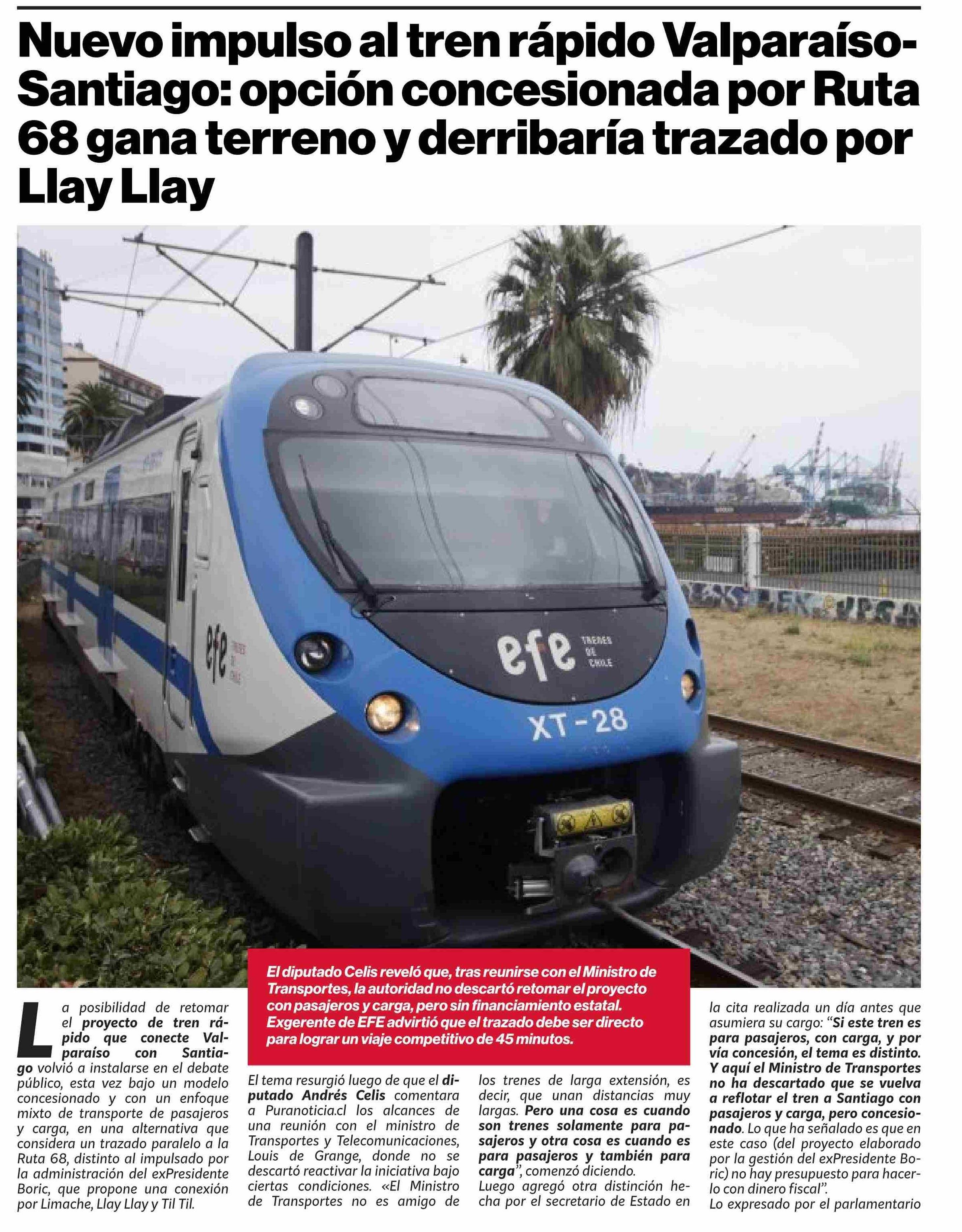 | Título: | Nuevo impulso al tren rápido Valparaíso- Santiago: opción concesionada por Ruta 68 gana terreno y derribaría trazado por Llay Llay |