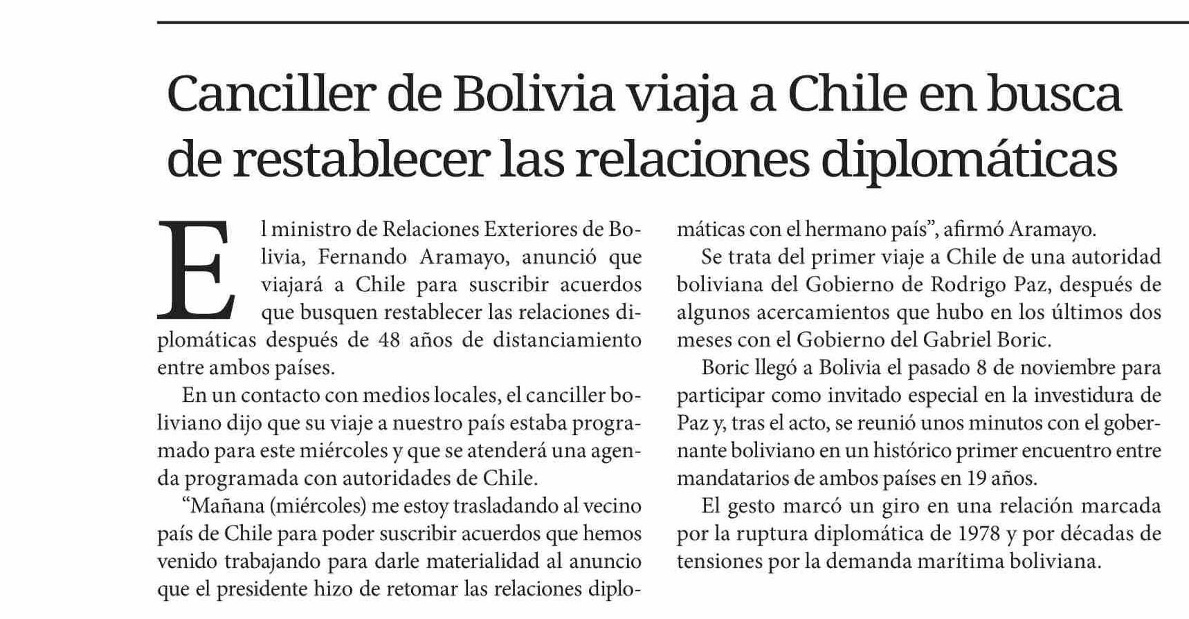 Canciller de Bolivia viaja a Chile en busca de restablecer las relaciones diplomáticas 15-01-2026 Diario Chañarcillo |
