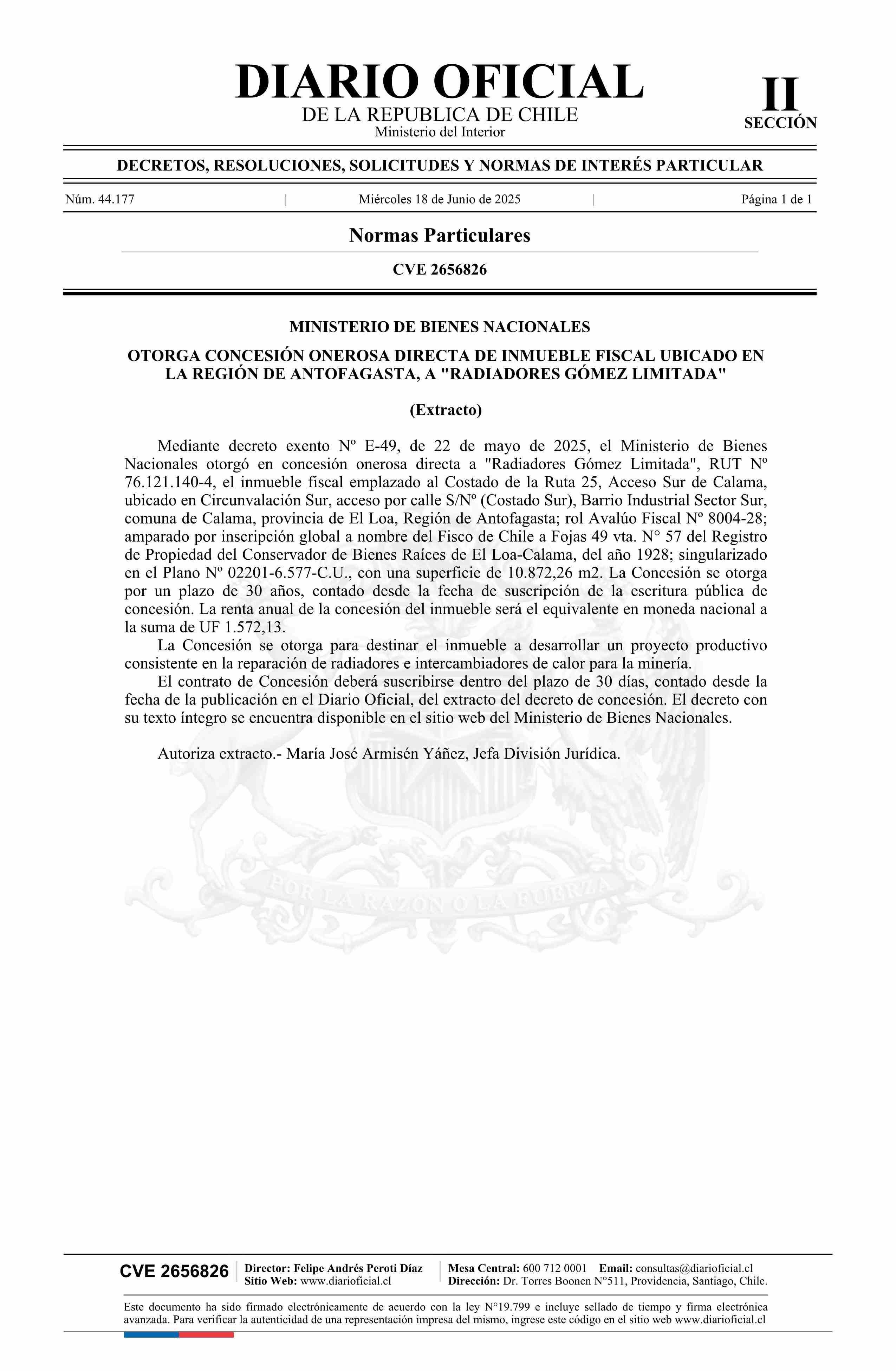| Título: | Extracto de decreto exento número E-49, de 2025.- Otorga concesión onerosa directa de inmueble fiscal ubicado en la Región de Antofagasta, a Radiadores Gómez Limitada |