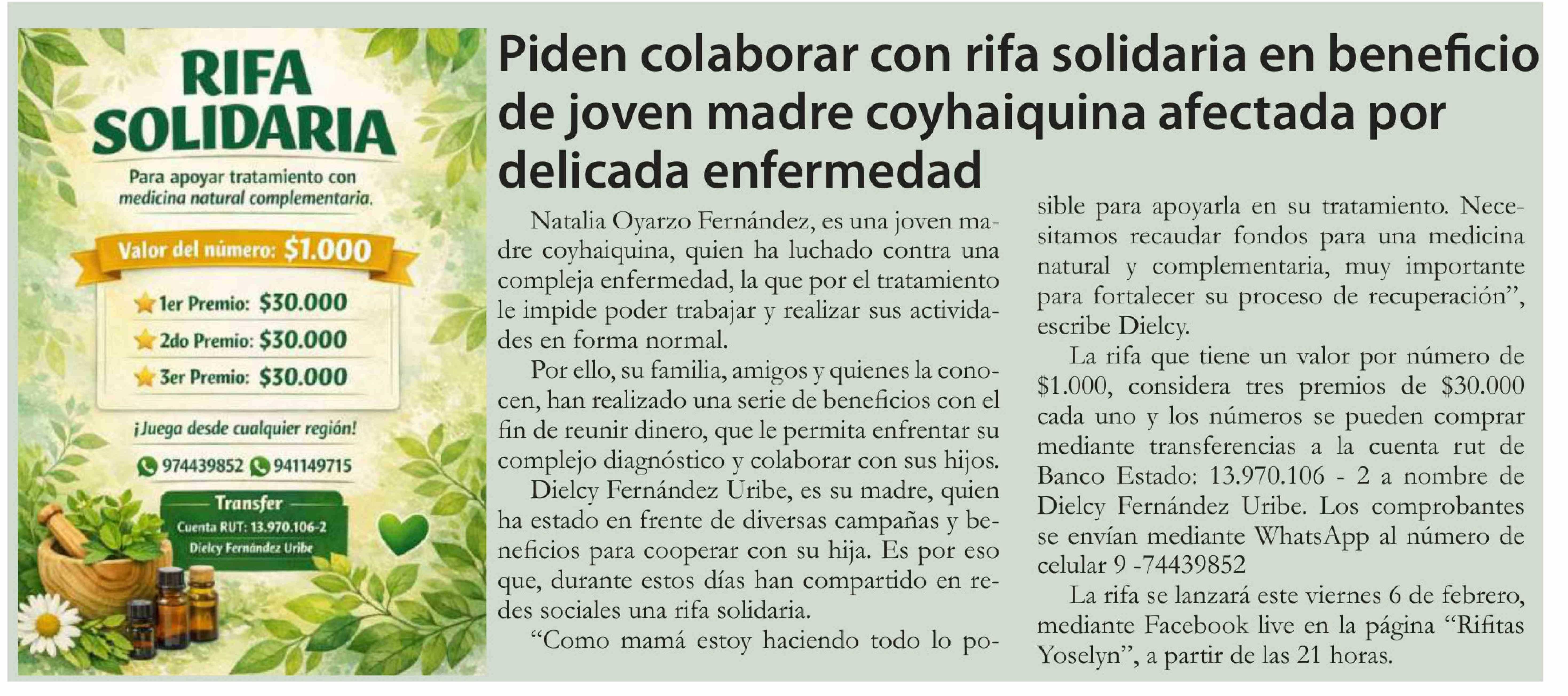 Título: Piden colaborar con rifa solidaria en beneficio de joven madre coyhaiquina afectada por delicada enfermedad
