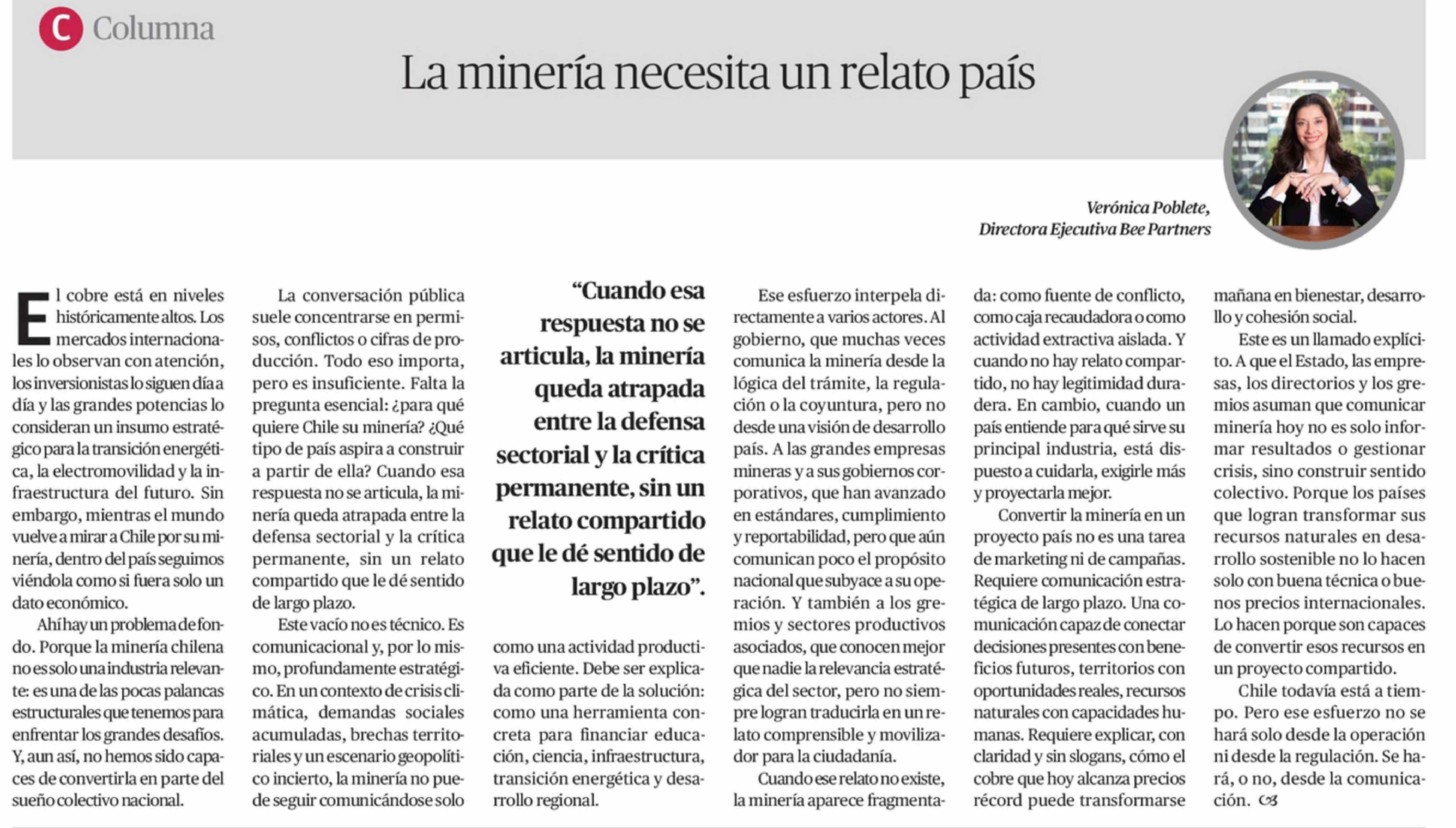 | Título: | Columnas de Opinión: La minería necesita un relato país |