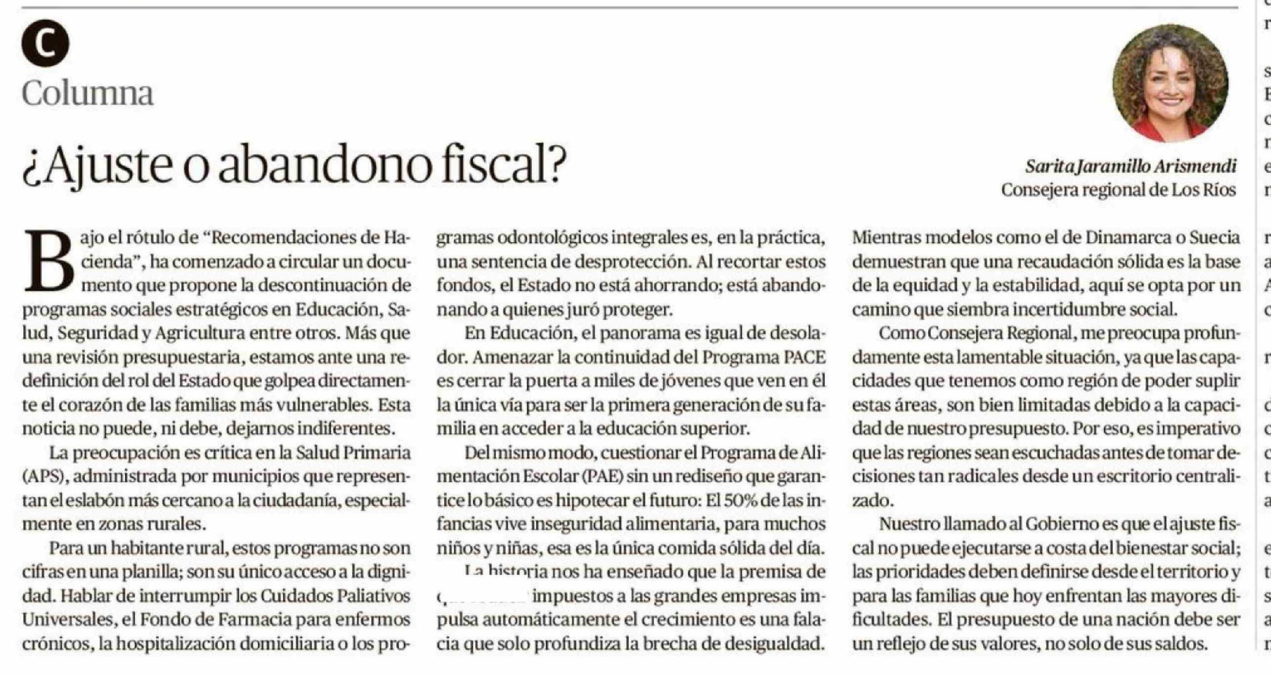 Columnas de Opinión: ¿Ajuste o abandono fiscal? 29-04-2026 Diario Austral Región de Los Ríos |