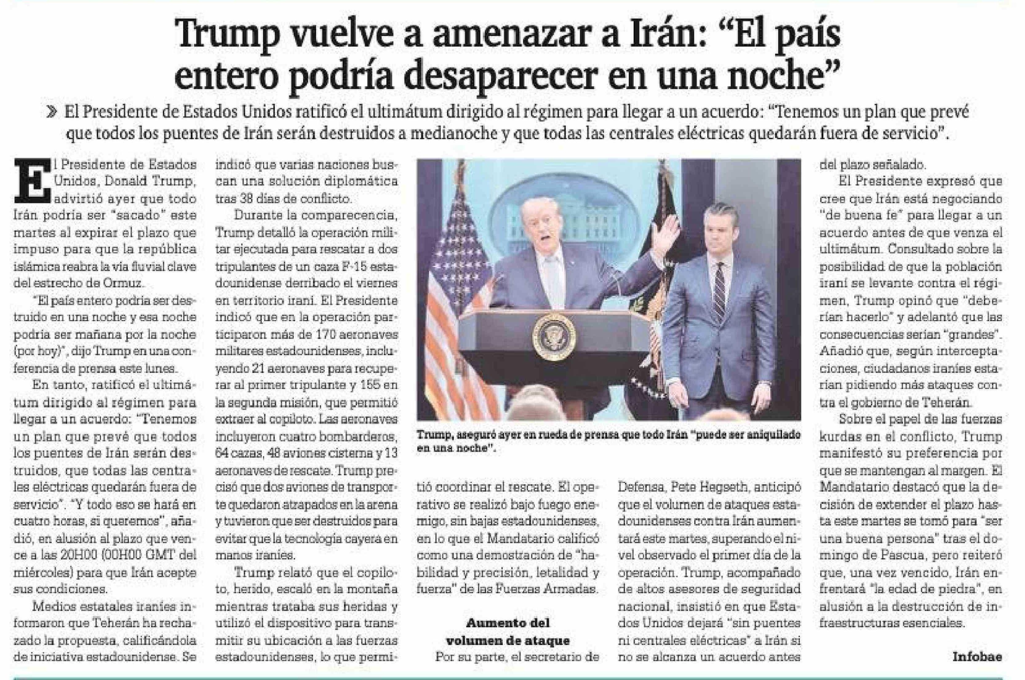 Trump vuelve a amenazar a Irán: "El país entero podría desaparecer en una noche" 07-04-2026 La Prensa Austral |