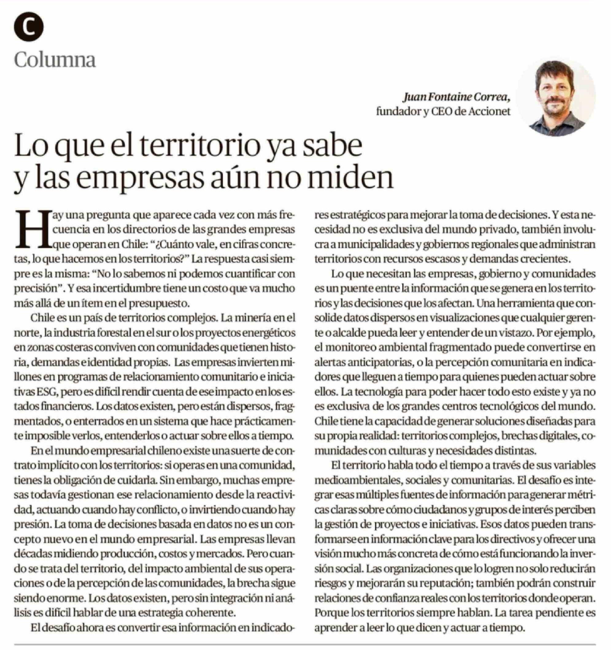 | Título: | Columnas de Opinión: Lo que el territorio ya sabe y las empresas aún no miden |