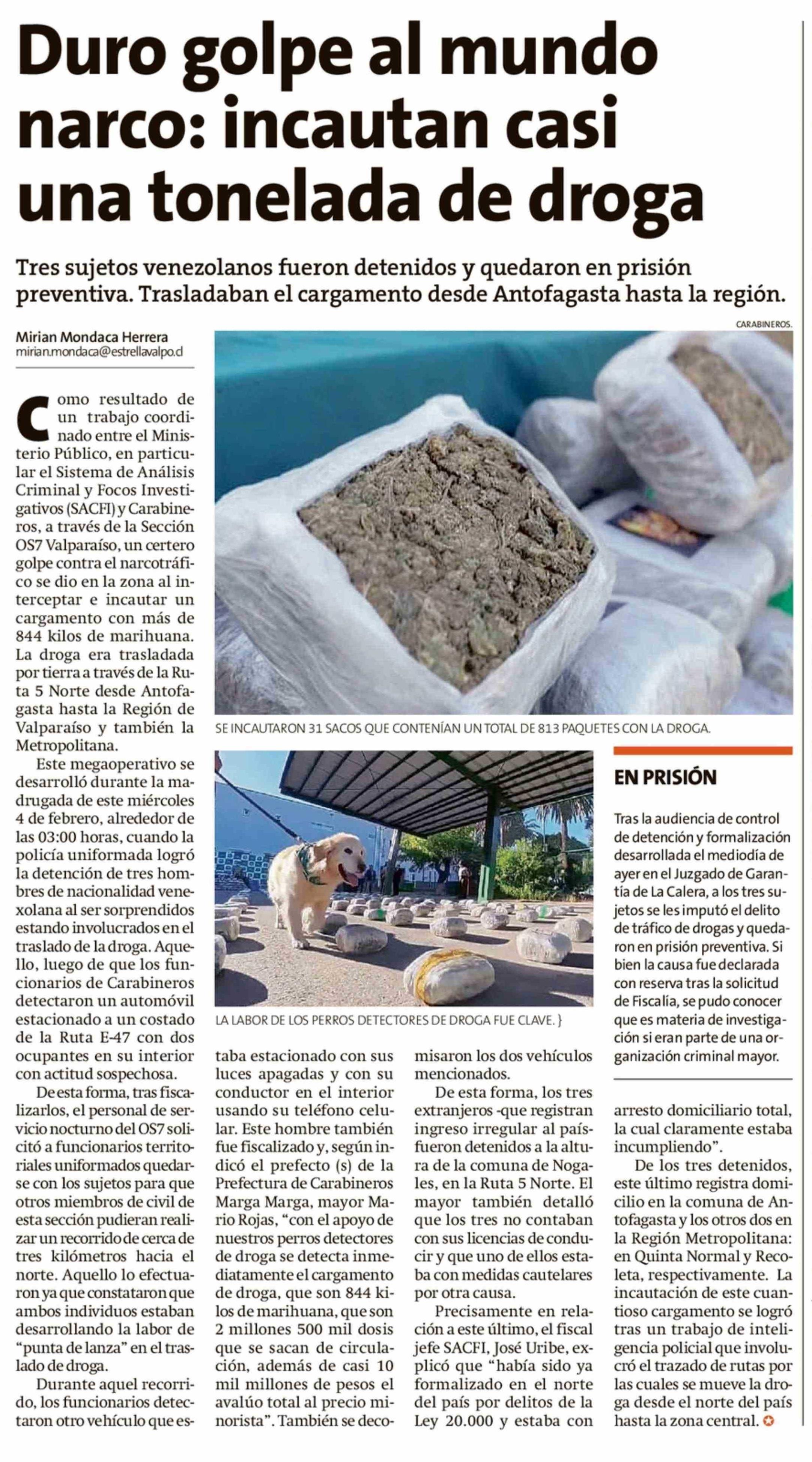 Duro golpe al mundo narco: incautan casi una tonelada de droga 07-02-2026 La Estrella de Valparaíso |