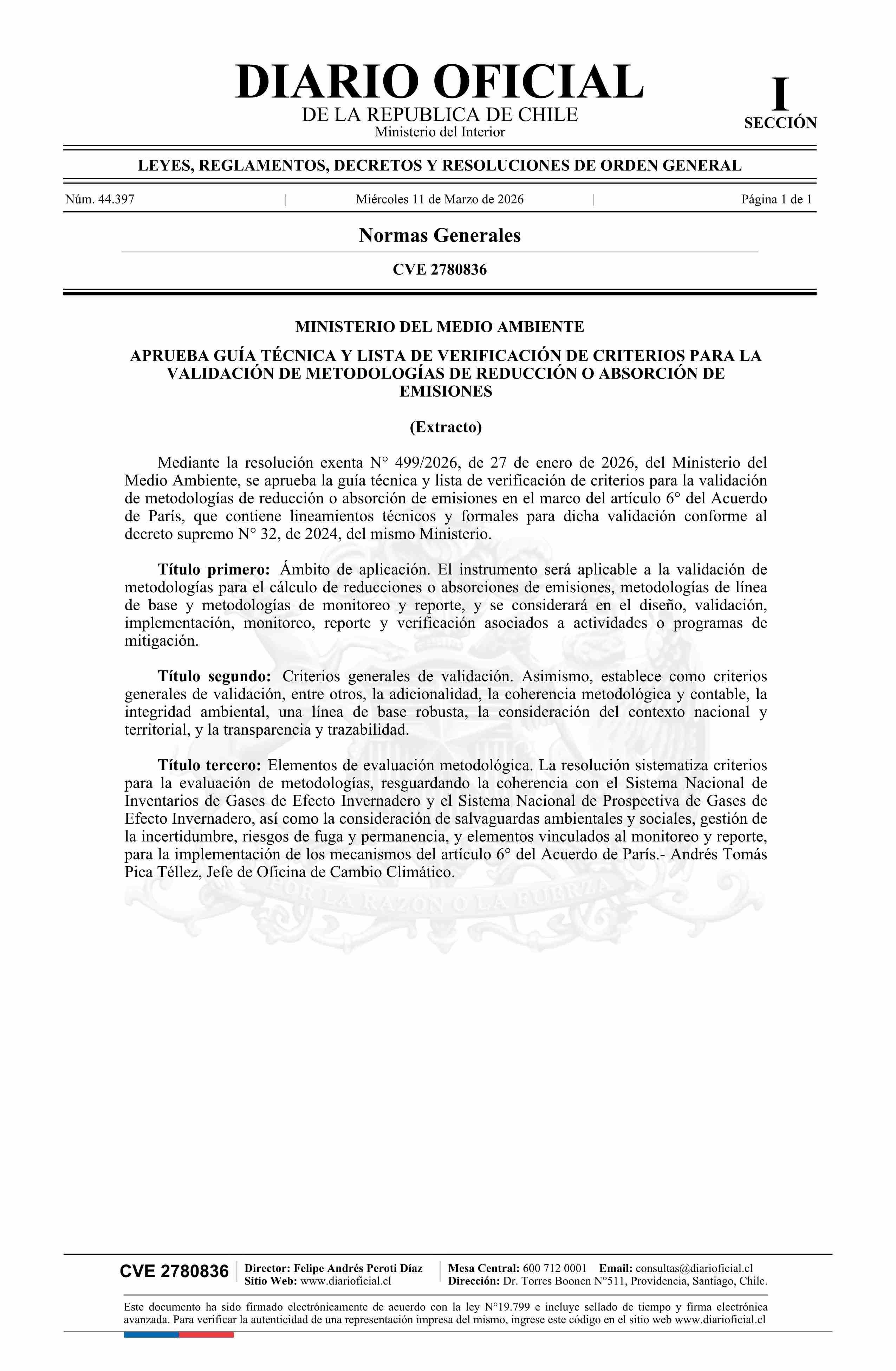 Título: Extracto de resolución exenta número 499, de 2026.- Aprueba guía técnica y lista de verificación de criterios para la validación de metodologías de reducción o absorción de emisiones