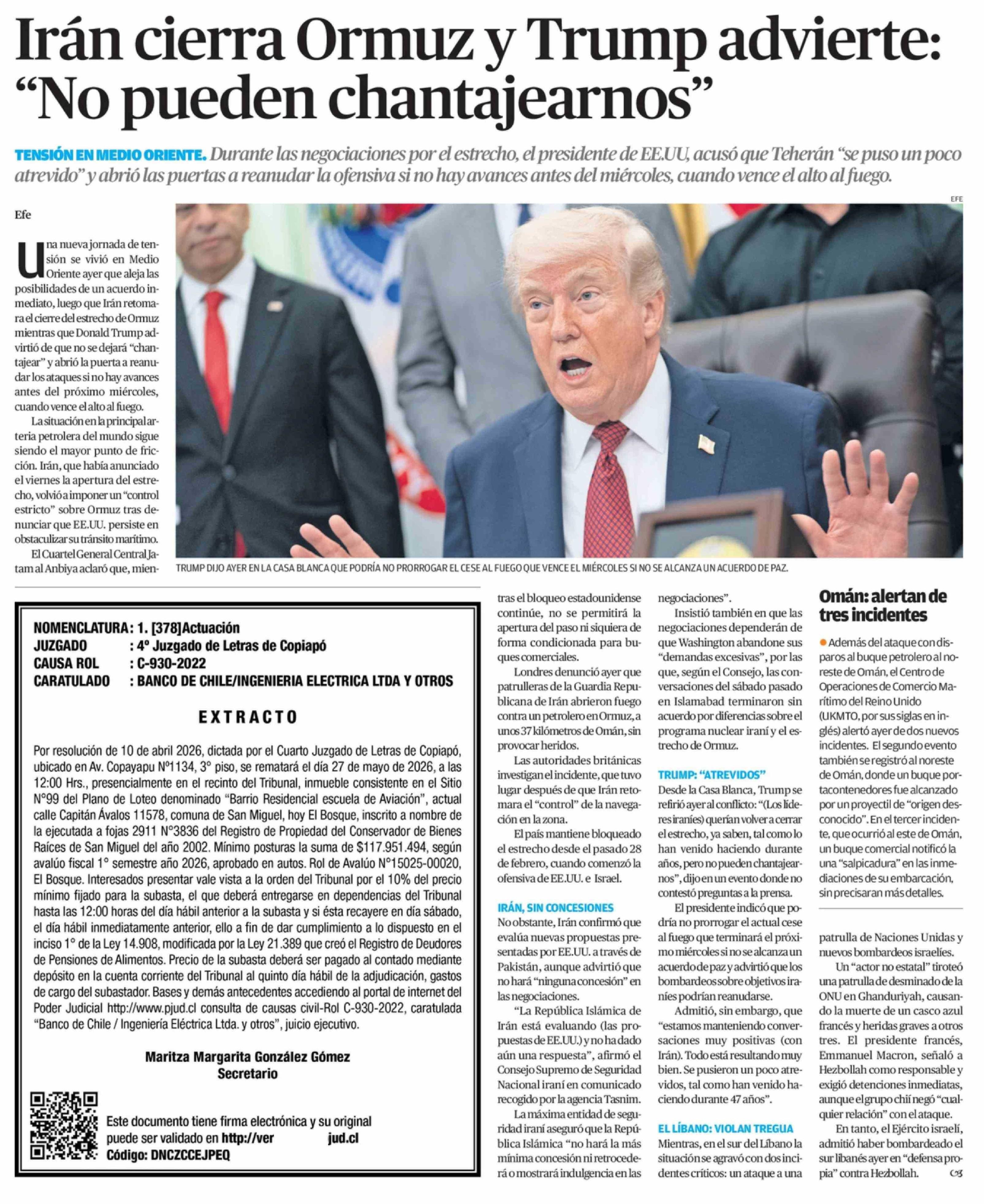 Irán cierra Ormuz y Trump advierte: "No pueden chantajearnos" 19-04-2026 El Diario de Atacama |