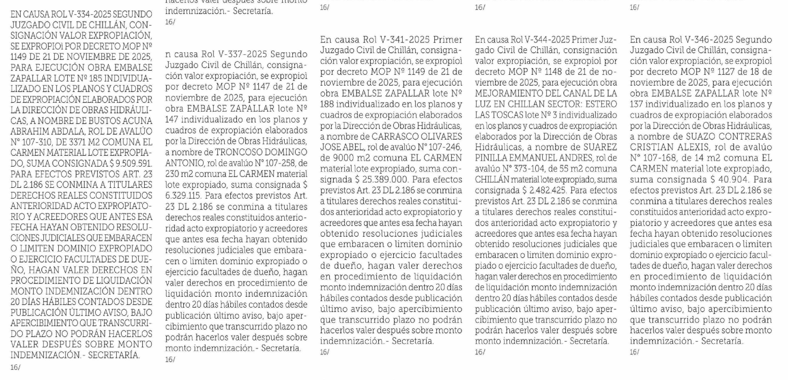 EN CAUSA ROL V-334-2025 SEGUNDO JUZGADO CIVIL DE CHILLÁN, CONSIGNACIÓN VALOR EXPROPIACIÓN, SE EXPROPIOÌ POR DECRETO MOP Nº 1149 DE 21 DE NOVIEMBRE DE 2025, PARA EJECUCIÓN OBRA EMBALSE ZAPALLAR LOTE Nº 185 INDIVIDUALIZADO EN LOS PLANOS Y CUADROS DE EXPROPIACIÓN ELABORADOS POR LA DIRECCIÓN DE OBRAS HI