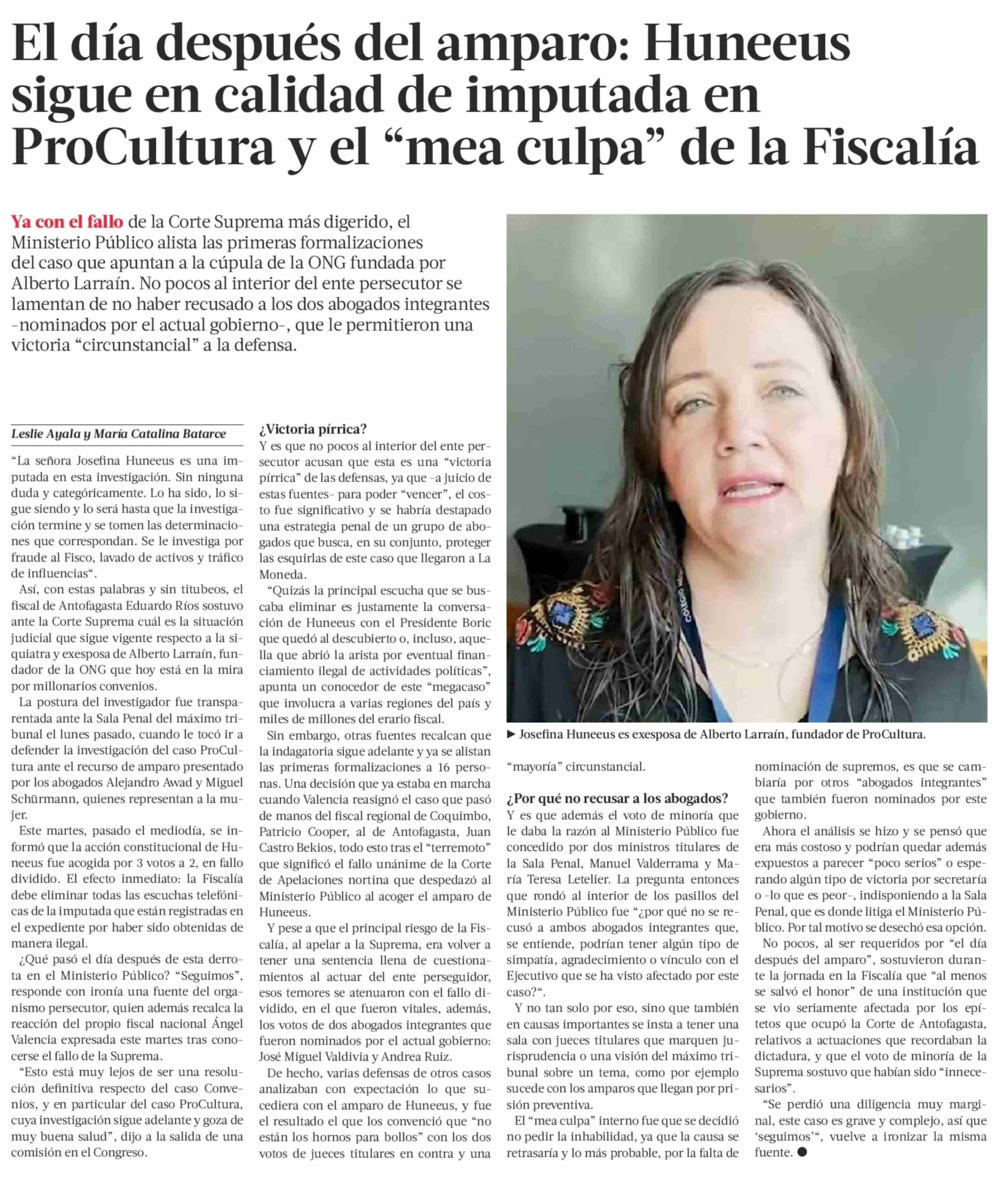 El día después del amparo: Huneeus sigue en calidad de imputada en ProCultura y el “mea culpa” de la Fiscalía 05-06-2025 La Tercera |