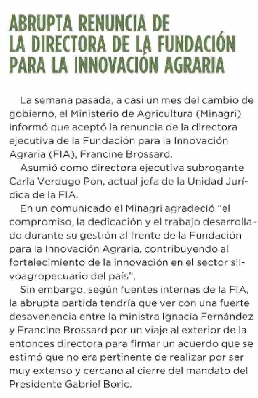 Título: ABRUPTA RENUNCIA DE , LA DIRECTORA DE LA FUNDACIÓN PARA LA INNOVACIÓN AGRARIA