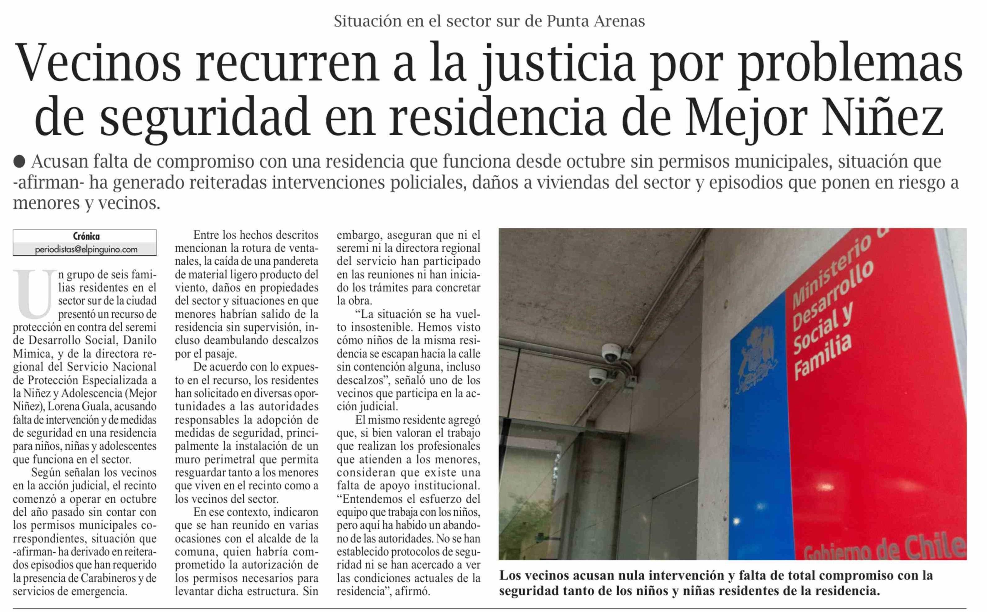 Vecinos recurren a la justicia por problemas de seguridad en residencia de Mejor Niñez 10-03-2026 El Pingüino |