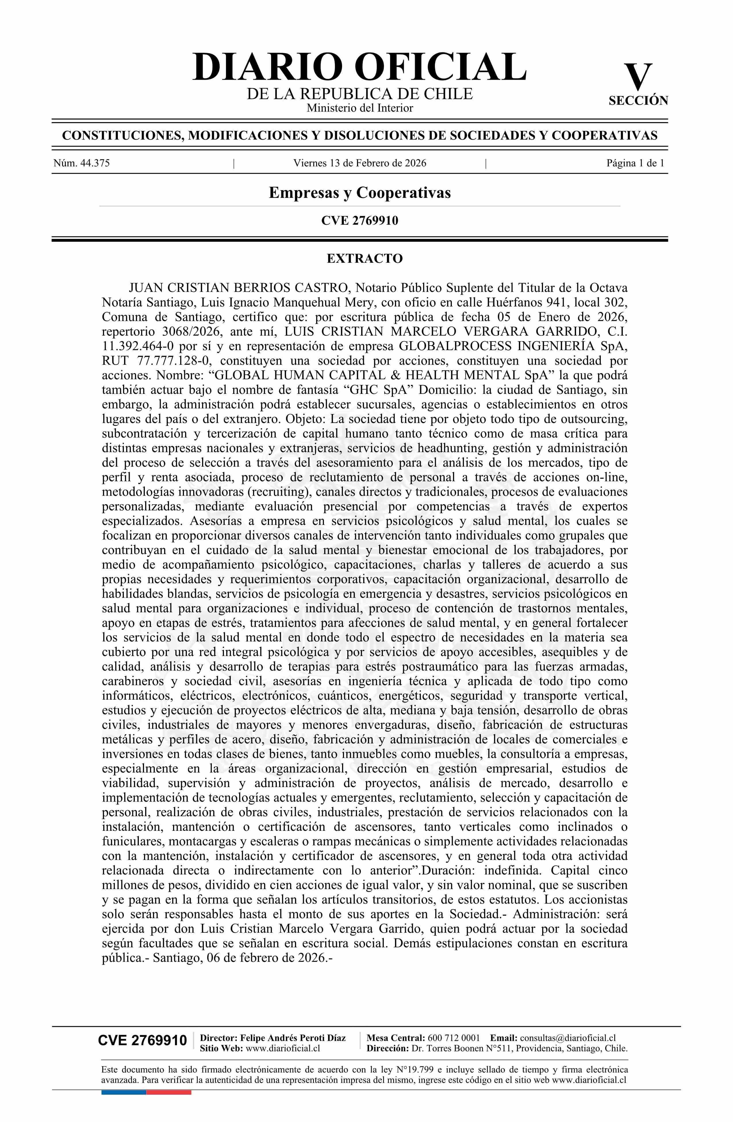 GLOBAL HUMAN CAPITAL & HEALTH MENTAL SpA 13-02-2026 Diario Oficial Edición Electrónica |