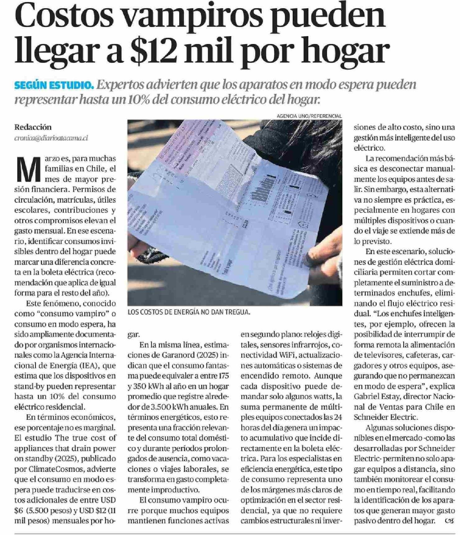 Costos vampiros pueden llegar a $12 mil por hogar 15-03-2026 El Diario de Atacama |