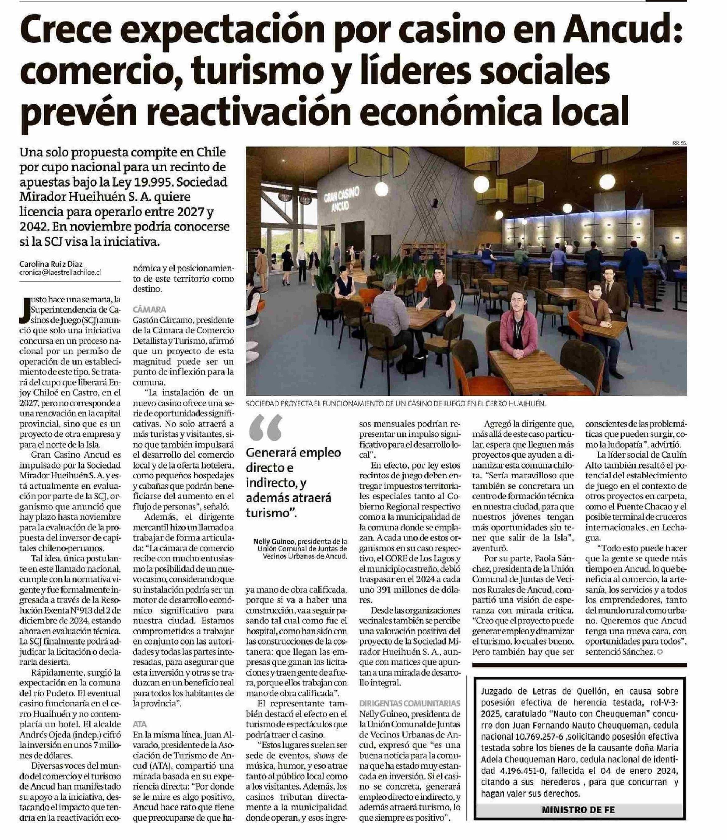 Crece expectación por casino en Ancud: comercio, turismo y líderes sociales prevén reactivación económica local 06-06-2025 La Estrella de Chiloé |
