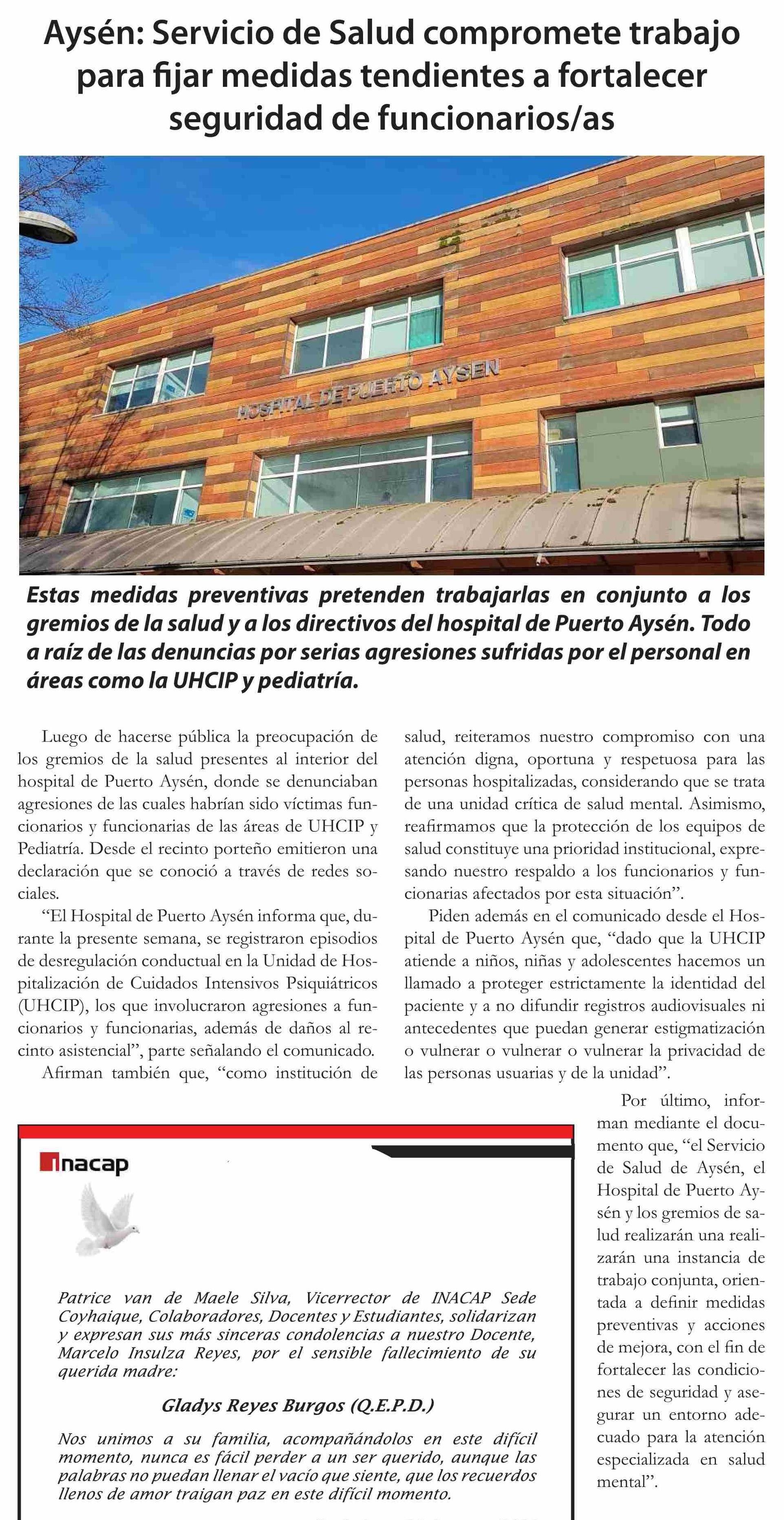 Título: Aysén: Servicio de Salud compromete trabajo para fijar medidas tendientes a fortalecer seguridad de funcionarios/as