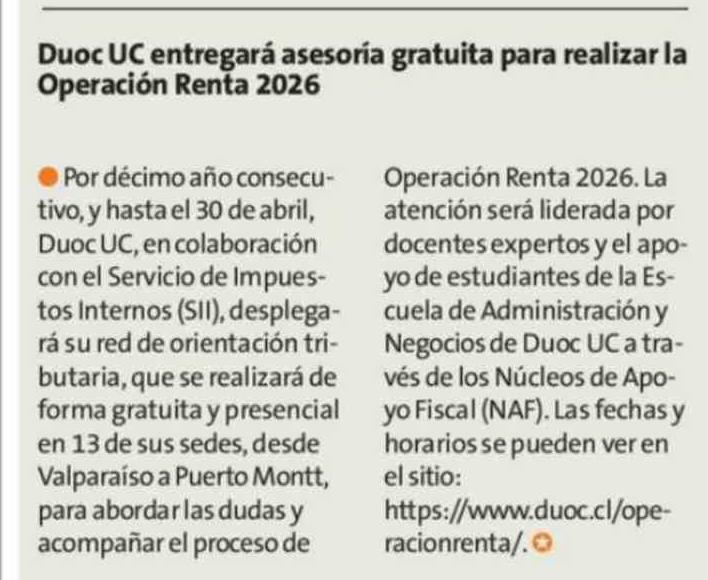 | Título: | Duoc UC entregará asesoría gratuita para realizar la Operación Renta 2026 |