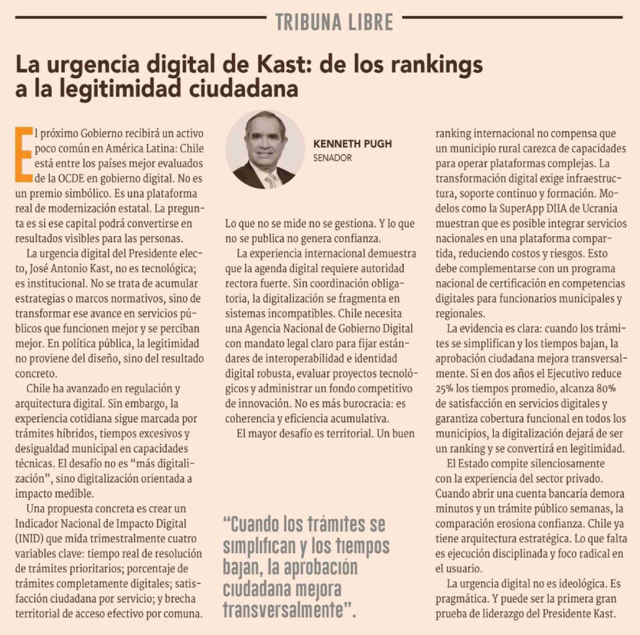 Columnas de Opinión: La urgencia digital de Kast: de los rankings a la legitimidad ciudadana 24-02-2026 Diario Financiero |