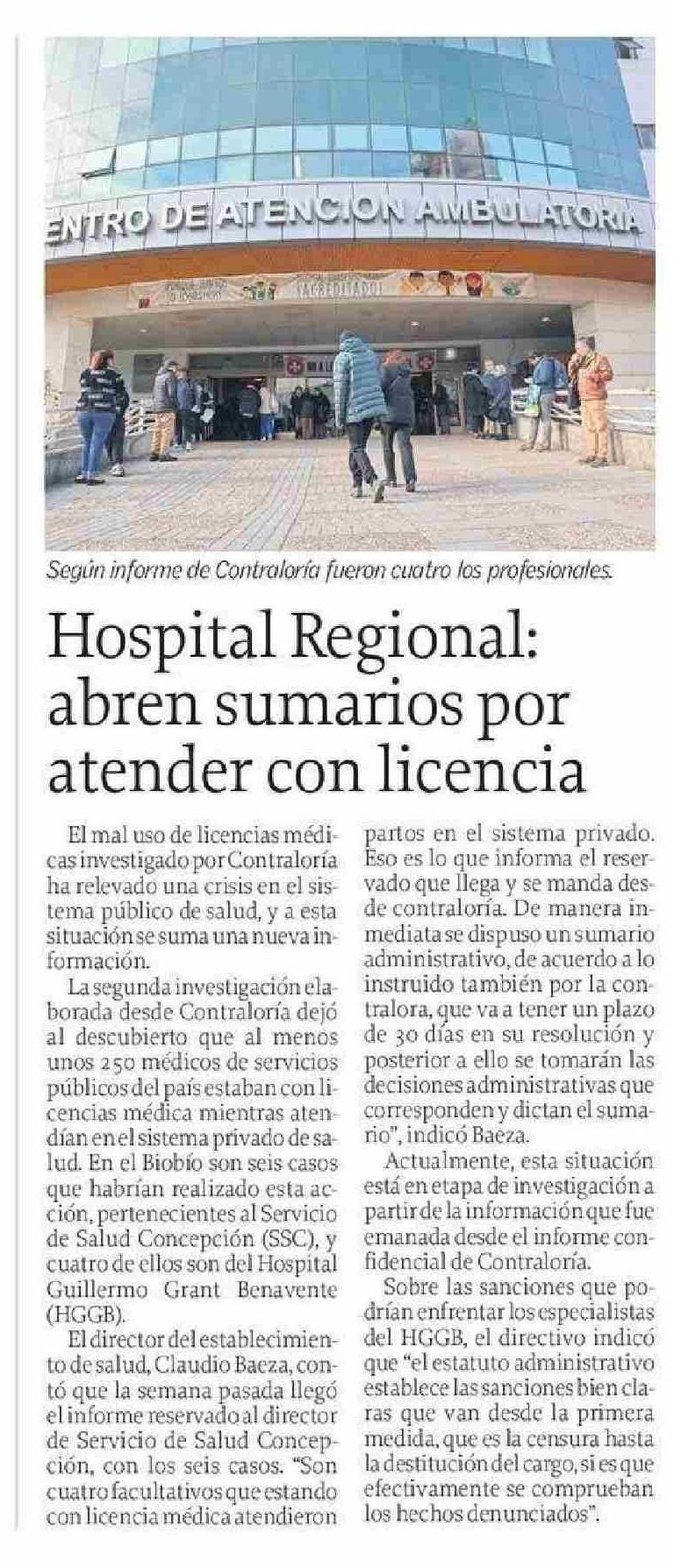 | Título: | Hospital Regional: abren sumarios por atender con licencia |