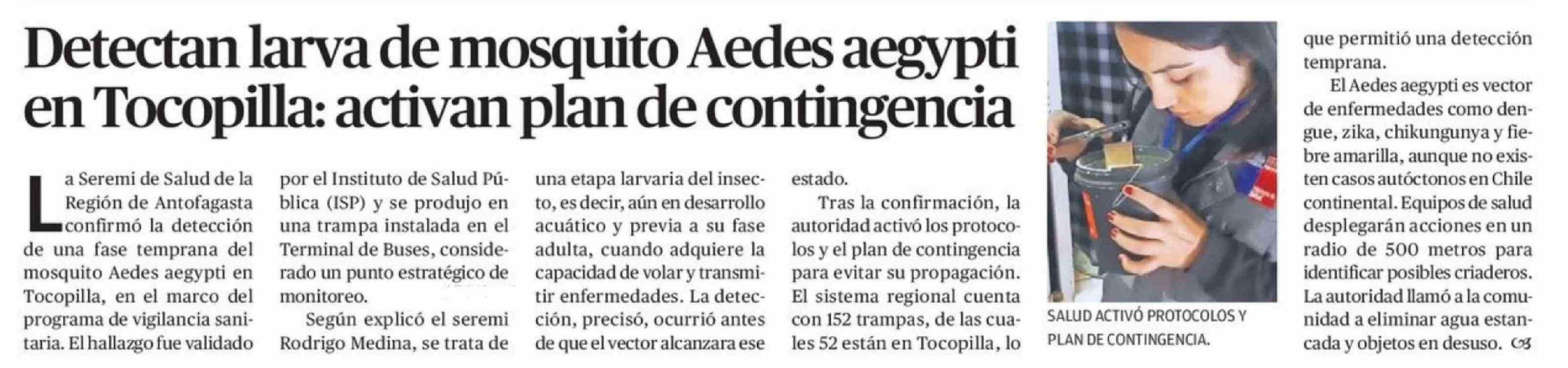 Detectan larva de mosquito Aedes aegypti en Tocopilla: activan plan de contingencia 24-04-2026 El Mercurio de Antofagasta |