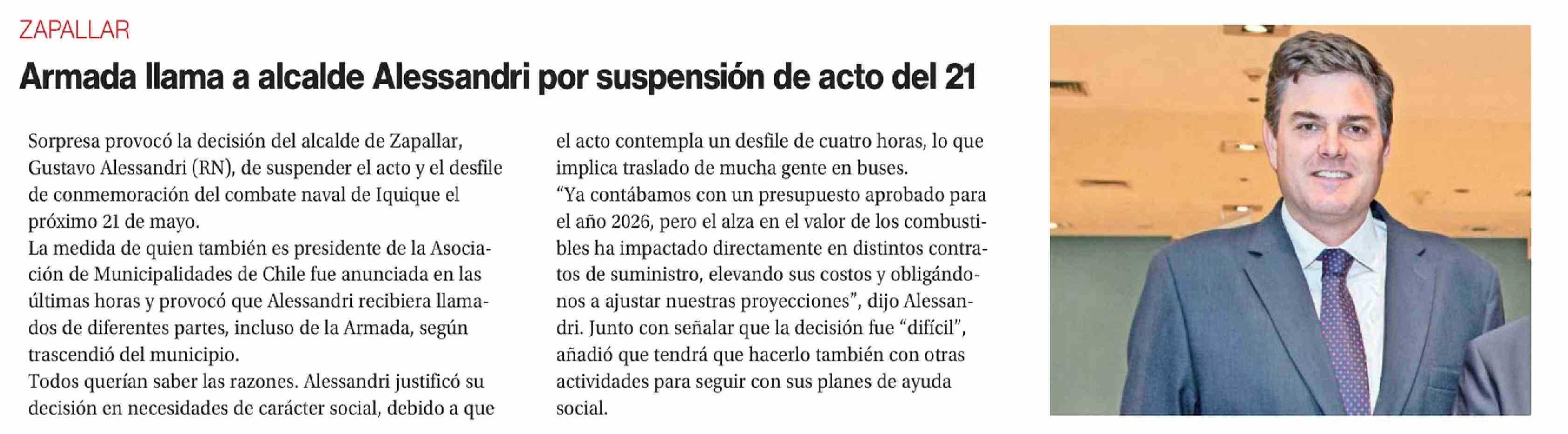 Armada llama a alcalde Alessandri por suspensión de acto del 21 23-04-2026 La Segunda |