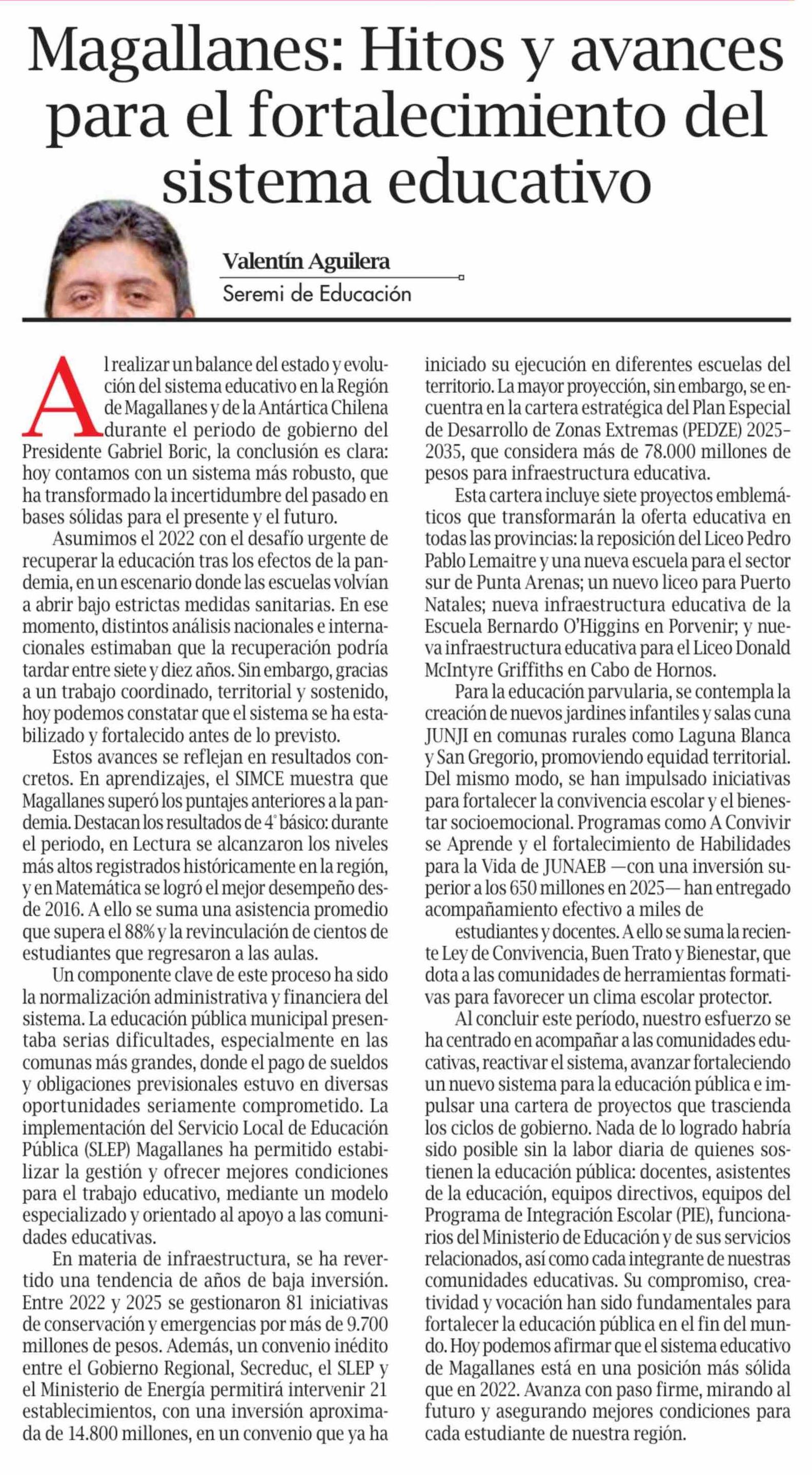 Título: Columnas de Opinión: Magallanes: Hitos y avances para el fortalecimiento del sistema educativo