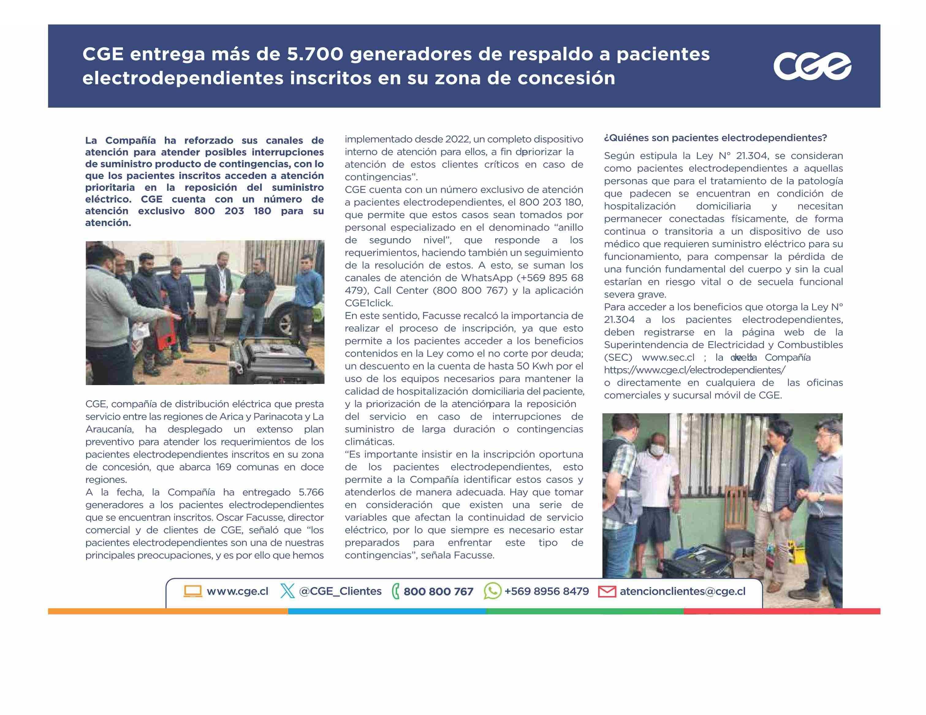 | Título: | CGE entrega más de 5700 generadores de respaldo a pacientes electrodependientes inscritos en su zona de concesión |