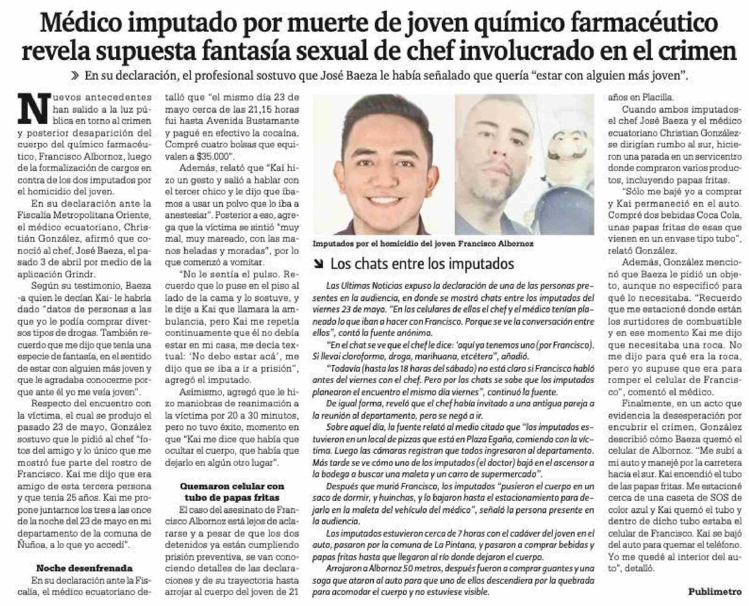| Título: | Médico imputado por muerte de joven químico farmacéutico revela supuesta fantasía sexual de chef involucrado en el crimen |