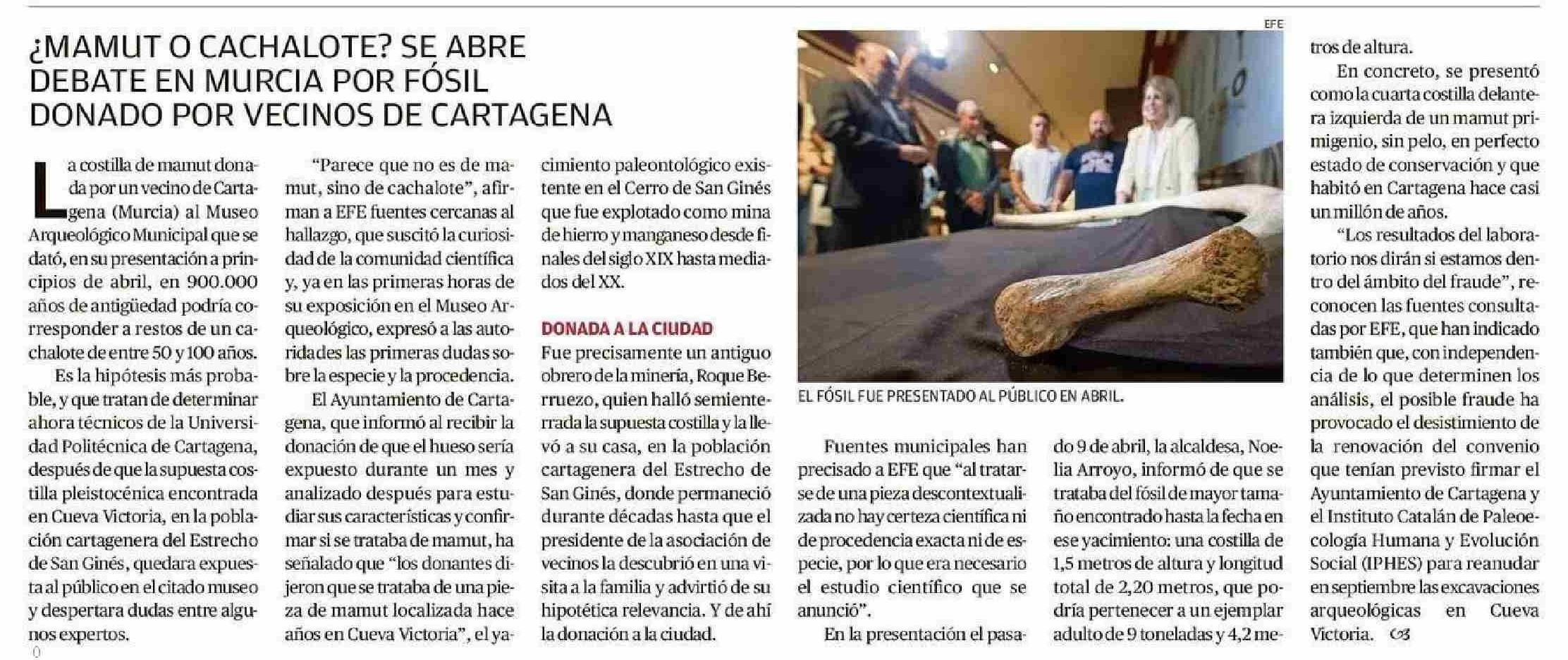 | Título: | ¿MAMUT O CACHALOTE? SE ABRE DEBATE EN MURCIA POR FÓSIL DONADO POR VECINOS DE CARTAGENA |