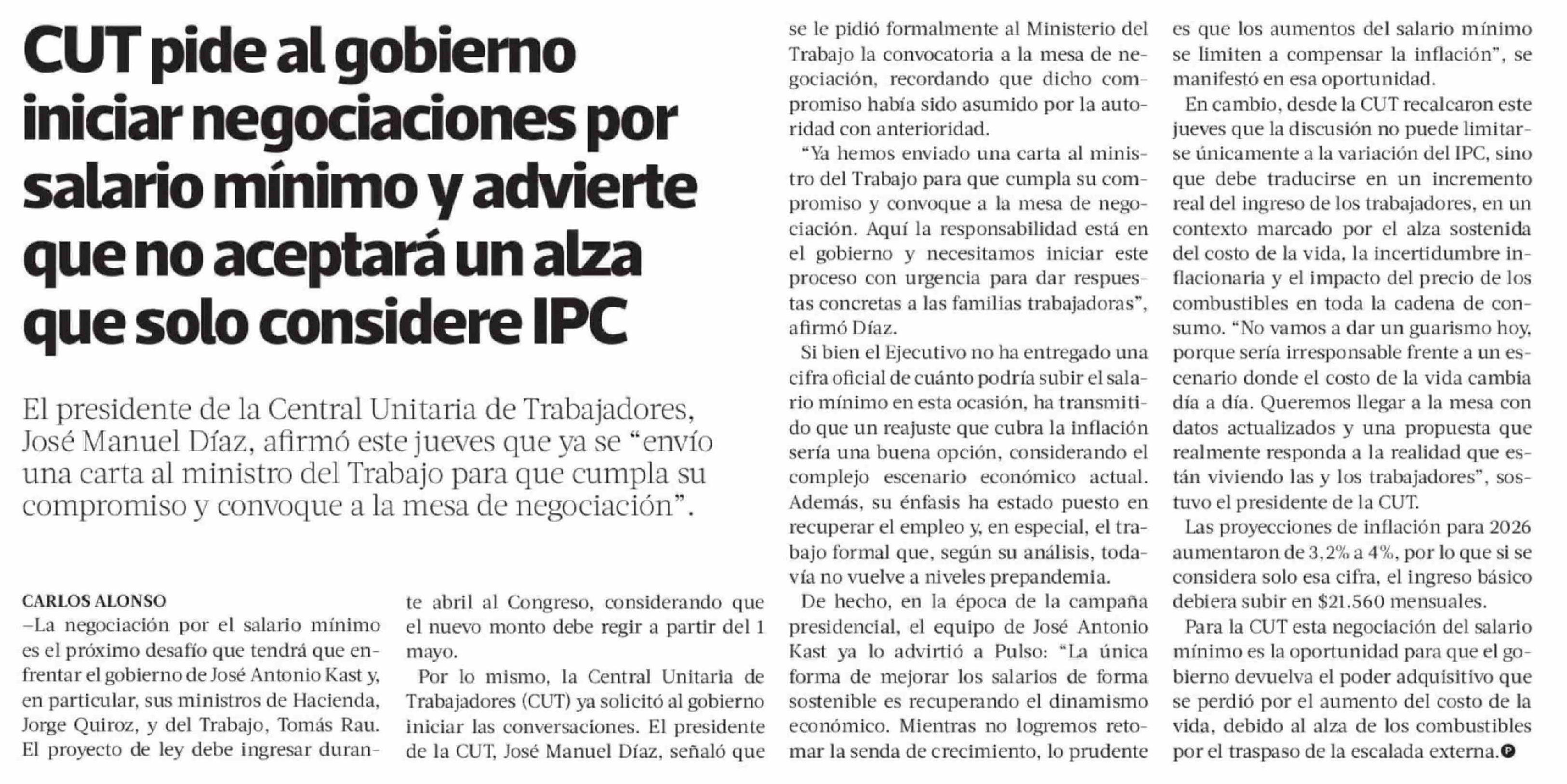 CUT pide al gobierno iniciar negociaciones por salario mínimo y advierte que no aceptará un alza que solo considere IPC 10-04-2026 La Tercera |