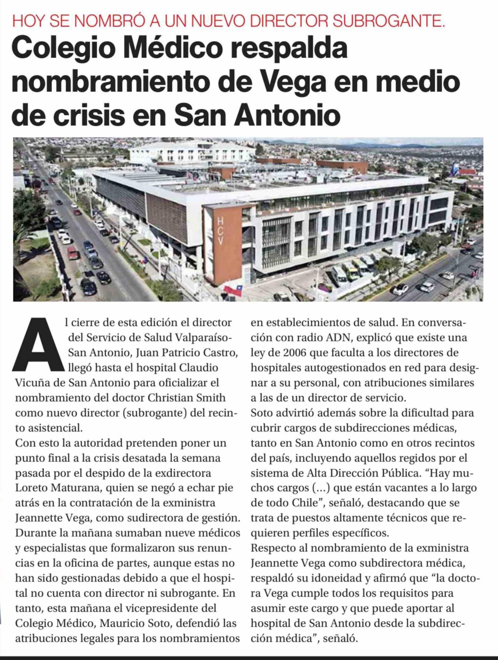 Colegio Médico respalda nombramiento de Vega en medio de crisis en San Antonio 27-04-2026 La Segunda |
