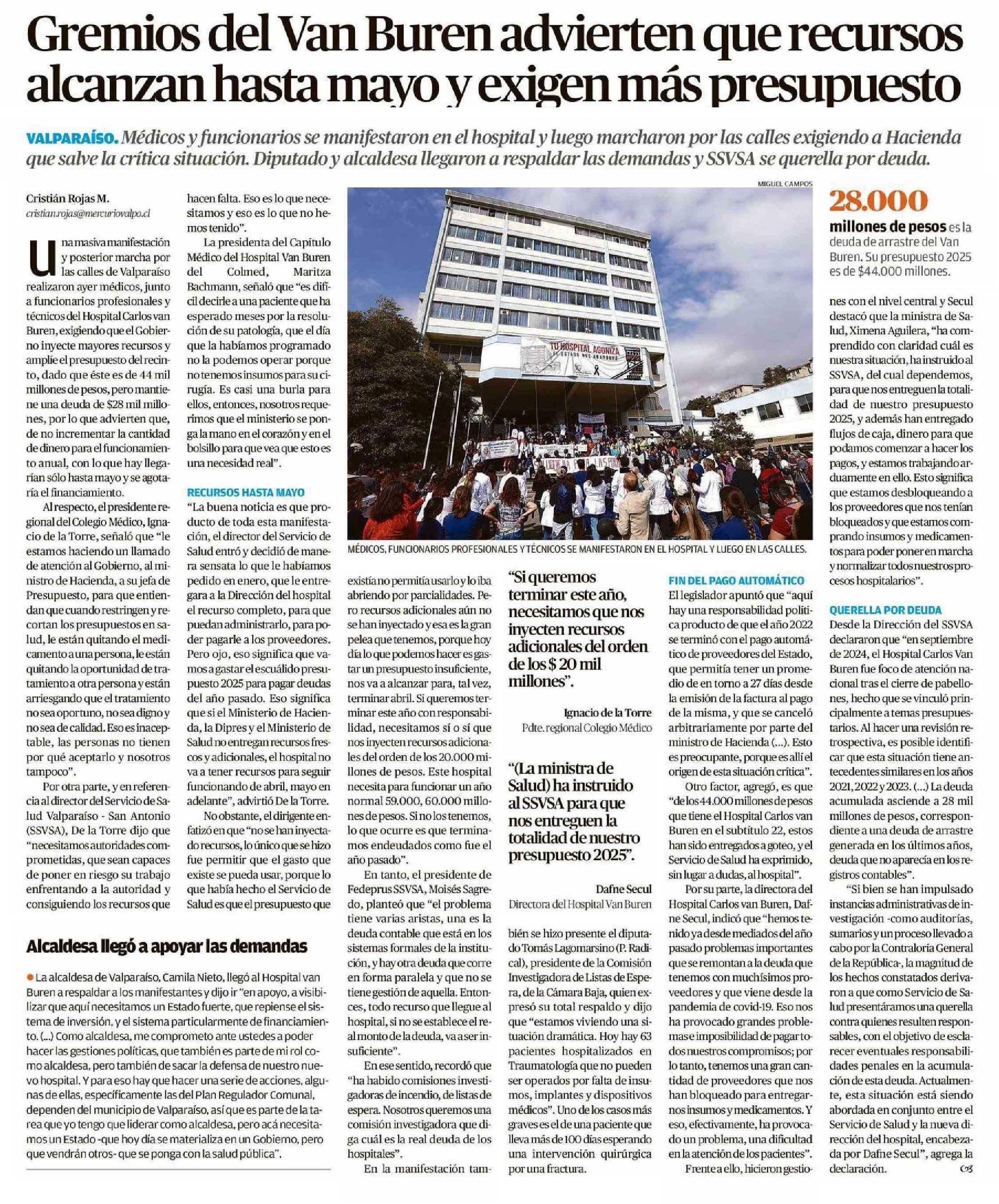 Gremios del Van Buren advierten que recursos alcanzan hasta mayo y exigen más presupuesto 26-03-2025 El Mercurio de Valparaíso |