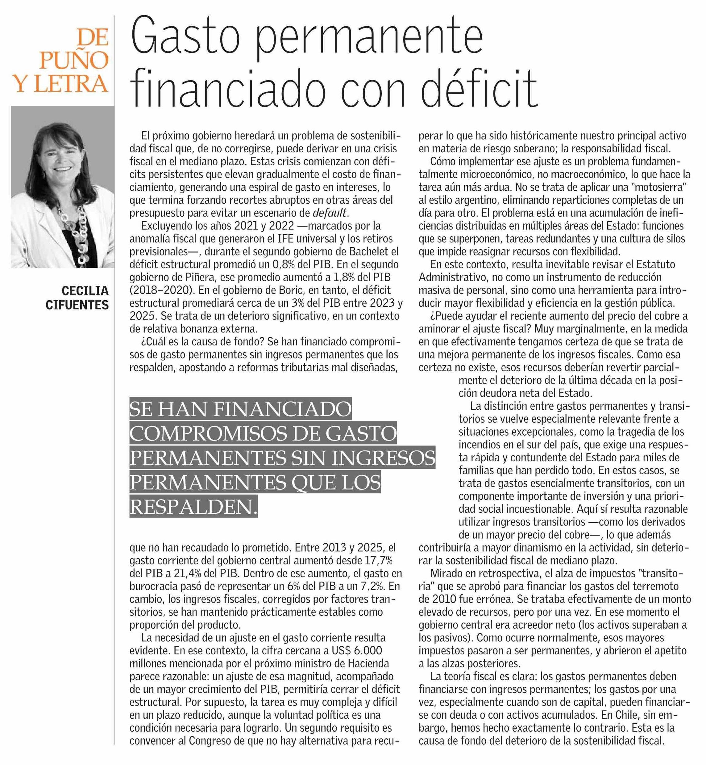 Columnas de Opinión: Gasto permanente financiado con déficit 27-01-2026 El Mercurio |