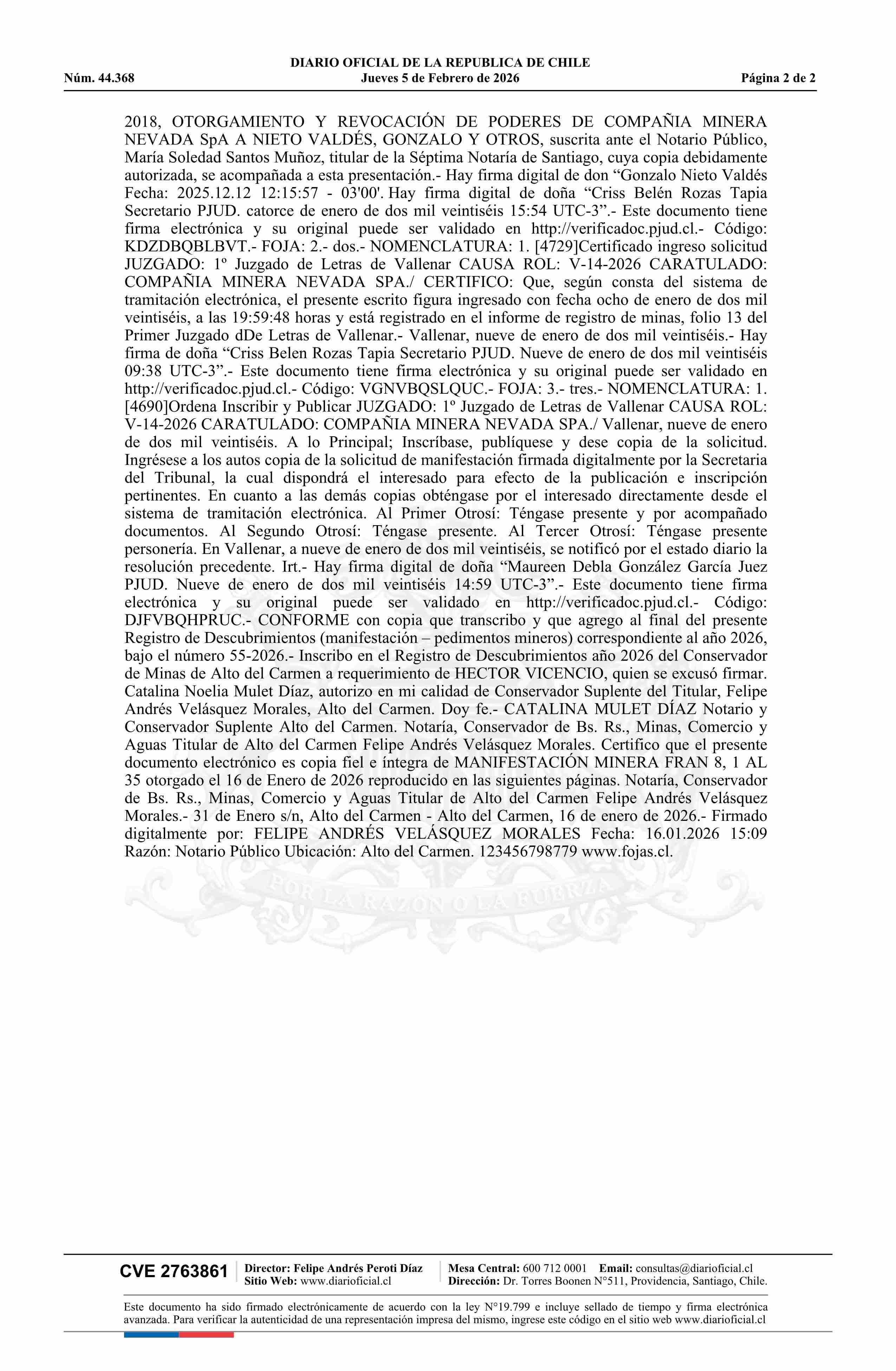 Fuente: DIARIO OFICIAL CHILE - BOLETÍN OFICIAL DE MINERÍA (DIARIO OFICIAL CHILE – BOM – MANIFESTACIONES MIN) Página(s): 53-54