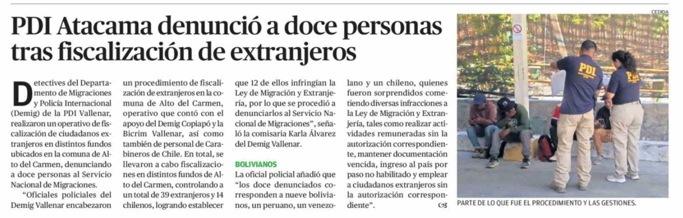 Título: PDI Atacama denunció a doce personas tras fiscalización de extranjeros