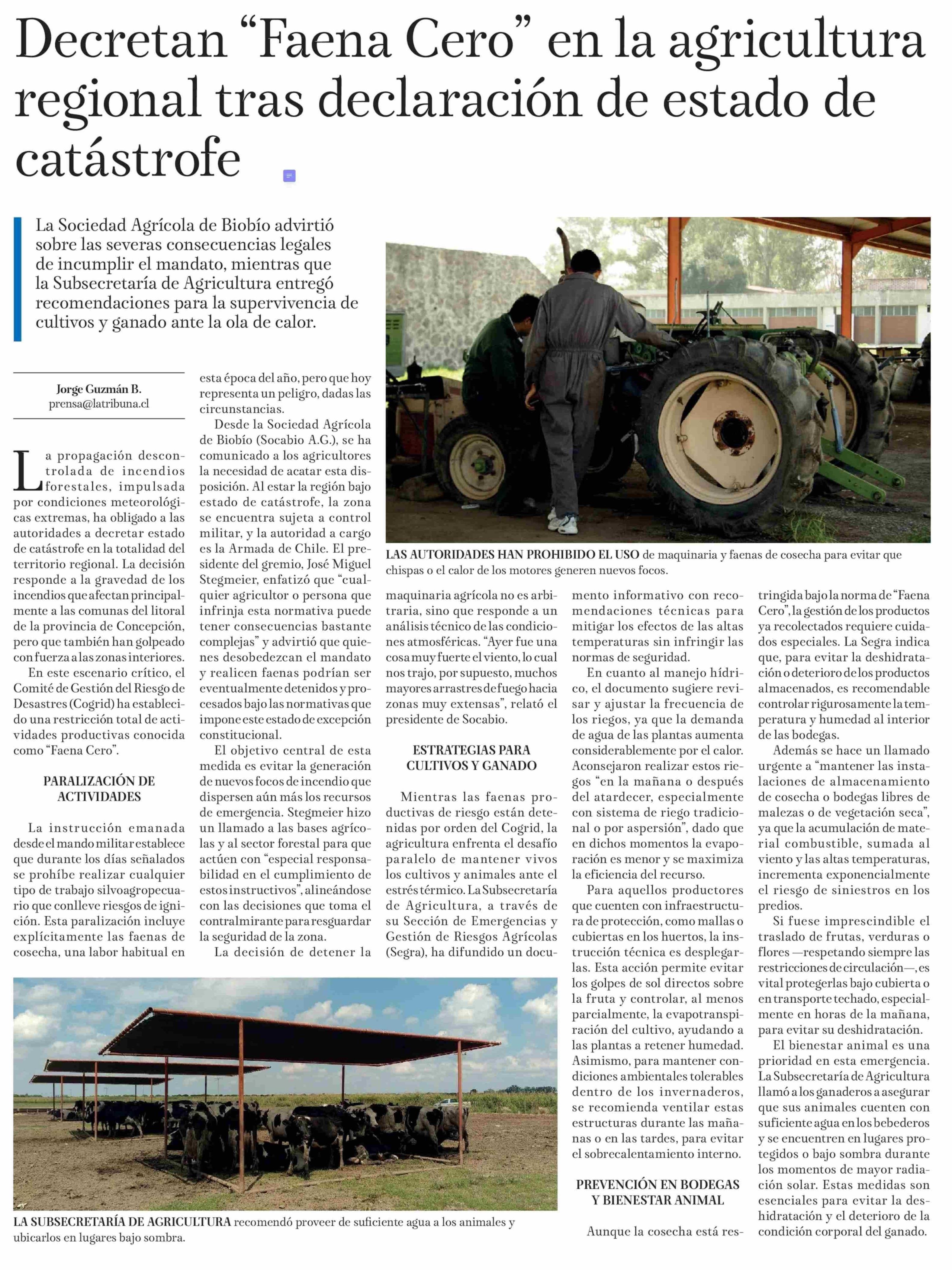 Decretan "Faena Cero" en la agricultura regional tras declaración de estado de catástrofe 20-01-2026 La Tribuna |