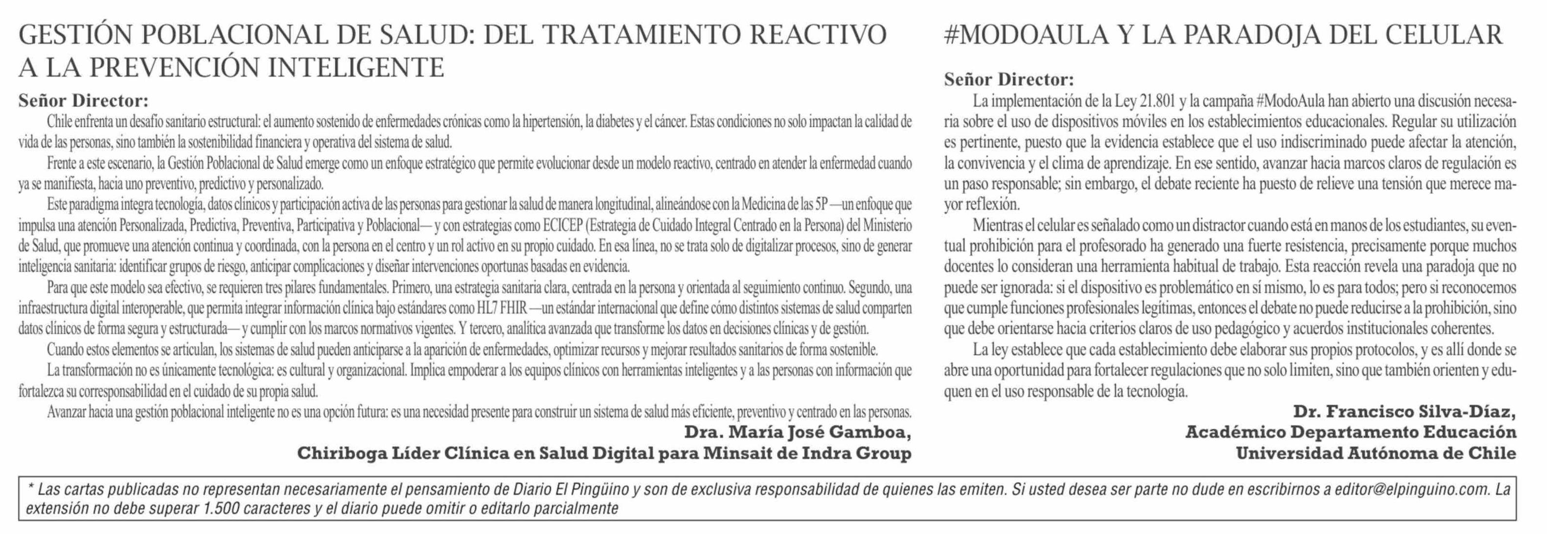 Cartas: GESTIÓN POBLACIONAL DE SALUD: DEL TRATAMIENTO REACTIVO ALA PREVENCIÓN INTELIGENTE 08-03-2026 El Pingüino |