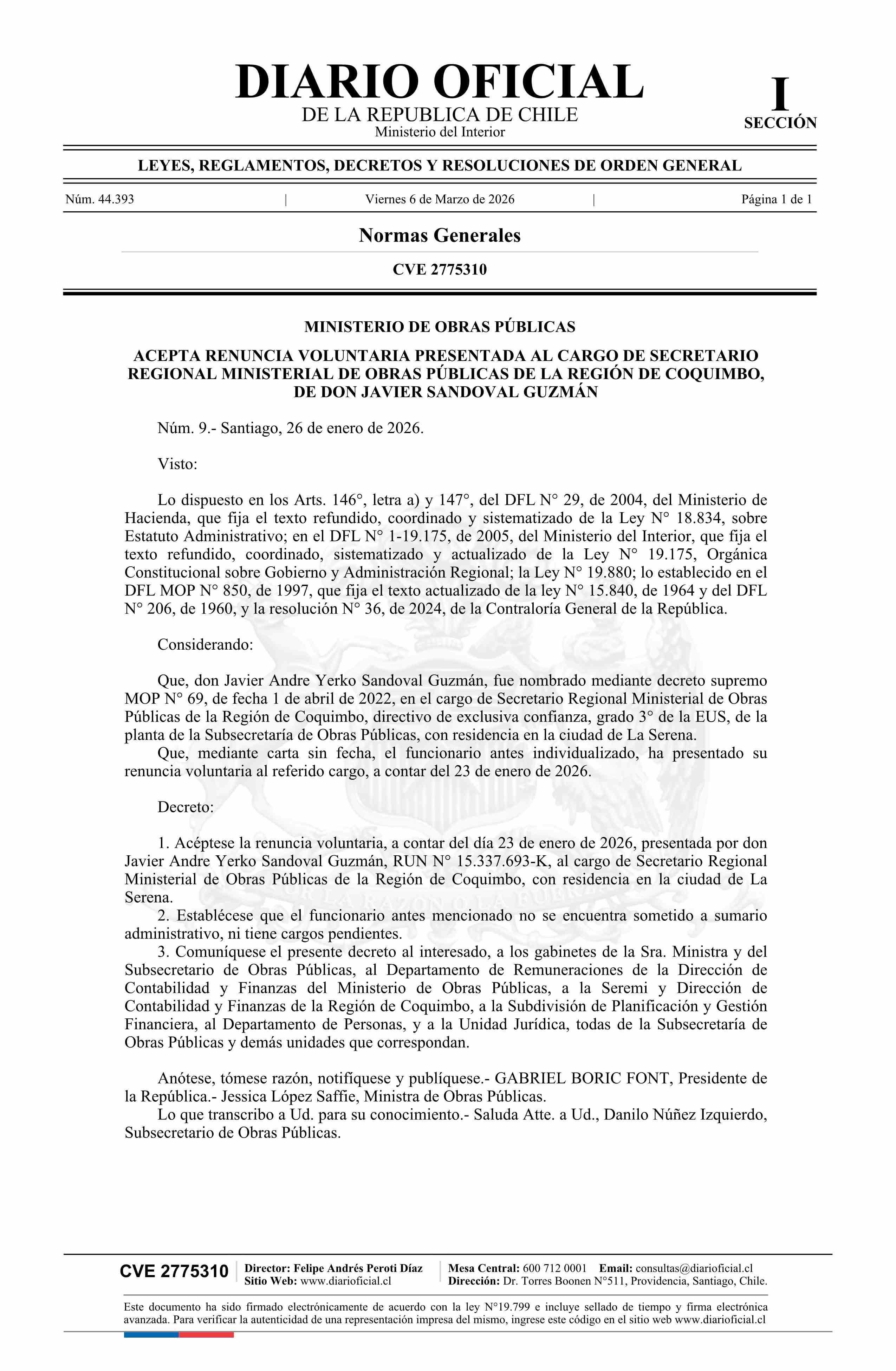 Título: Decreto número 9, de 2026.- Acepta renuncia voluntaria de don Javier Sandoval Guzmán al cargo de Secretario Regional Ministerial de Obras Públicas de la Región de Coquimbo