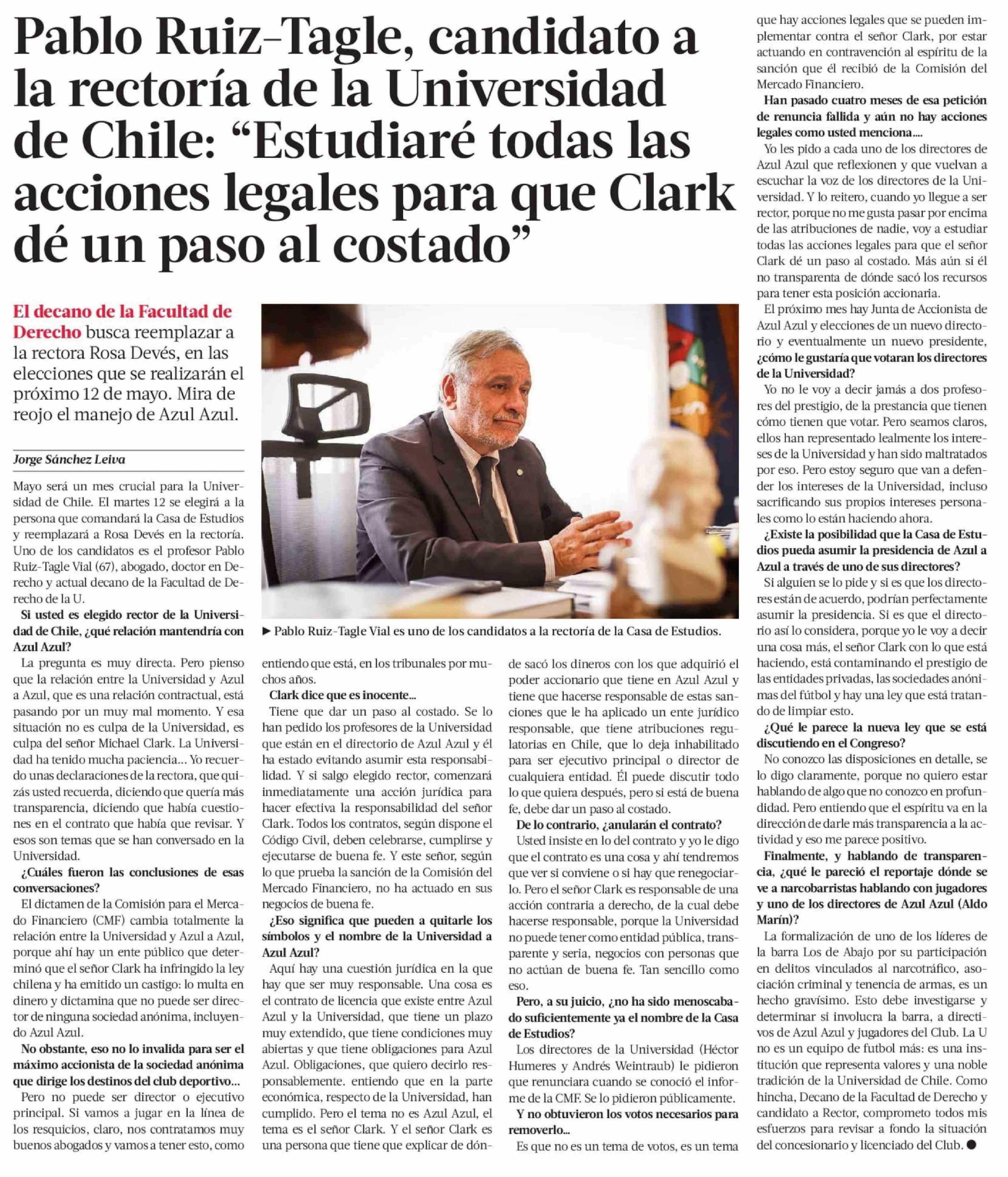 | Título: | Pablo Ruiz-Tagle, candidato a la rectoría de la Universidad de Chile: "Estudiaré todas las acciones legales para que Clark dé un paso al costado" |