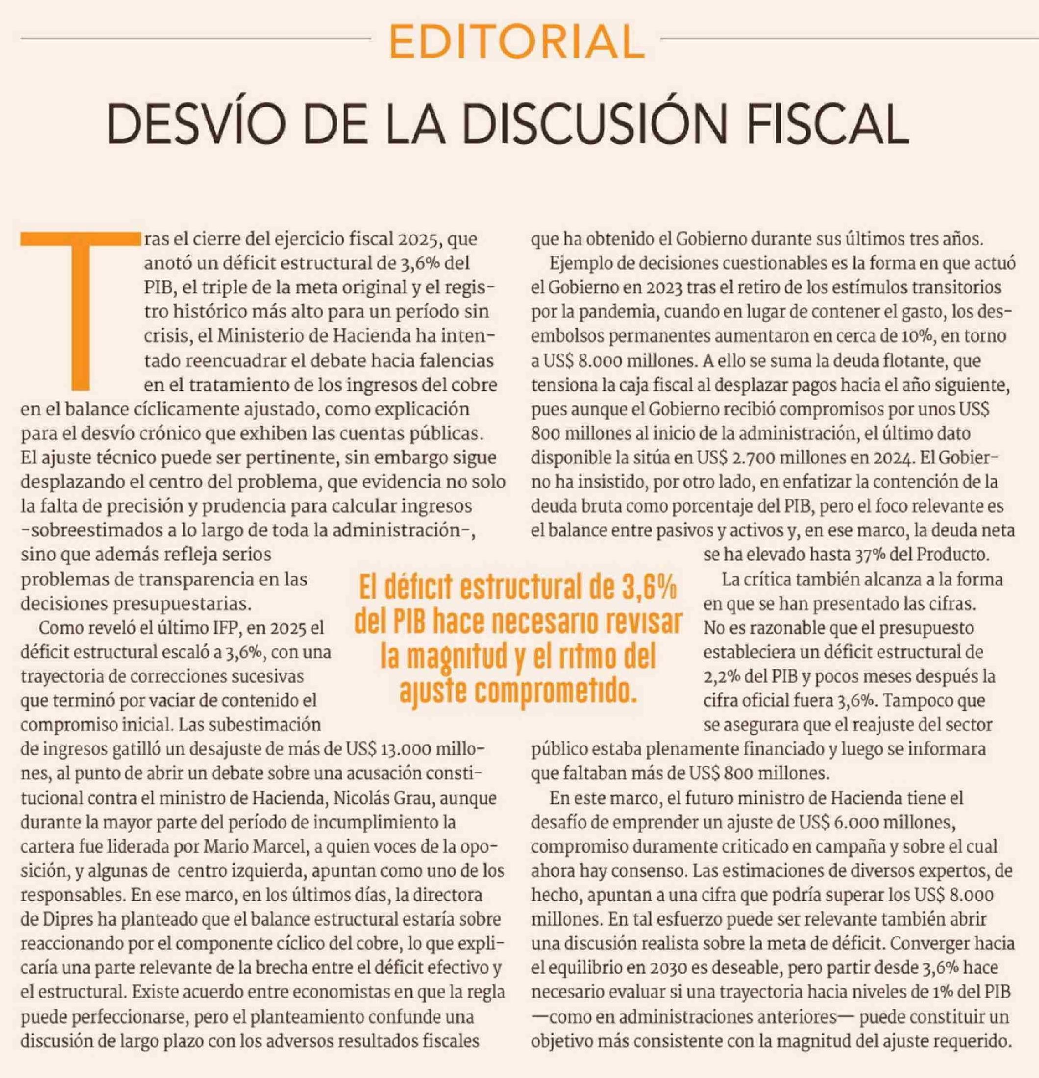 Editorial: DESVÍO DE LA DISCUSIÓN FISCAL 23-02-2026 Diario Financiero |